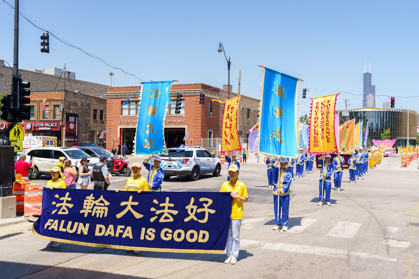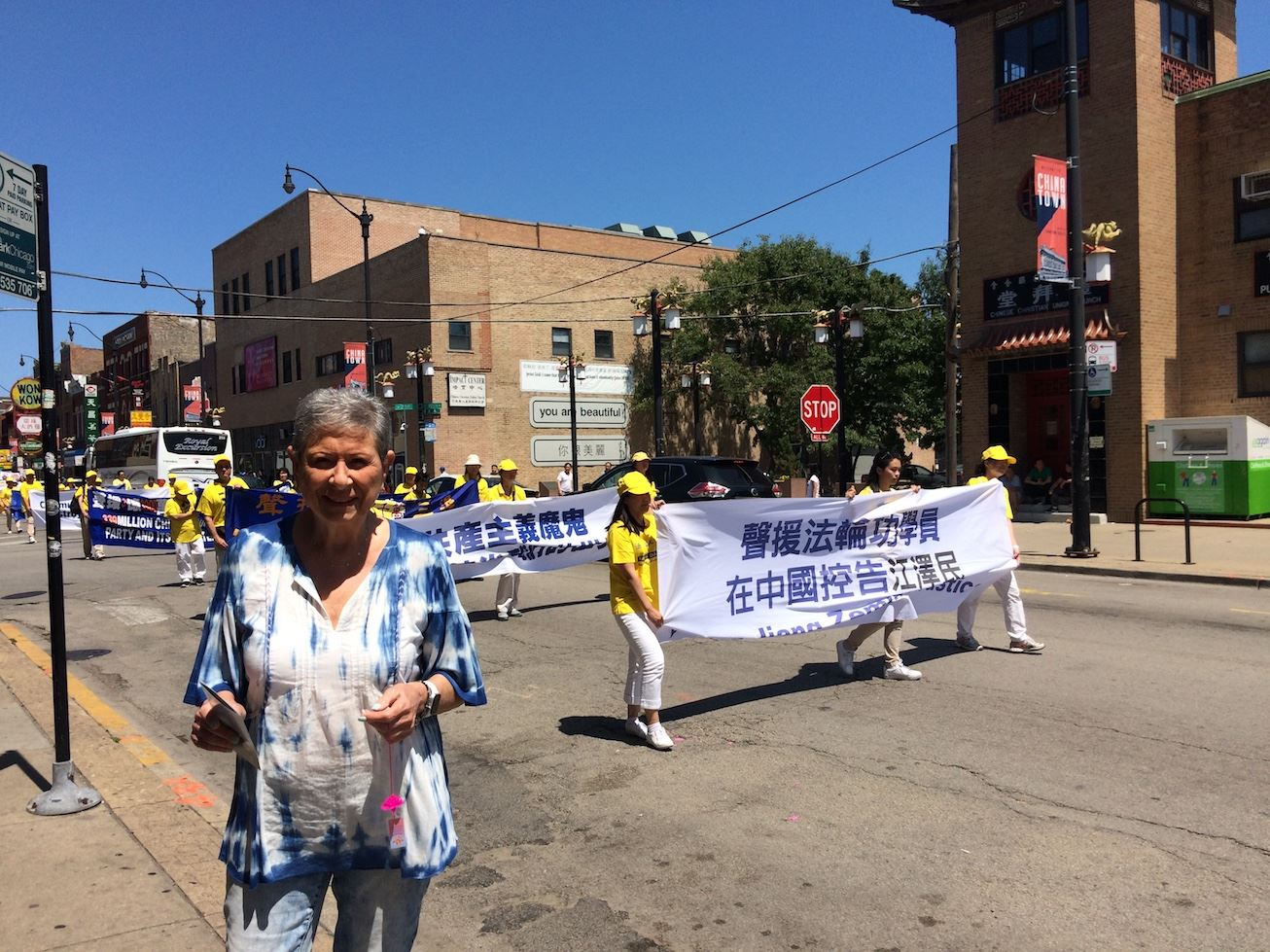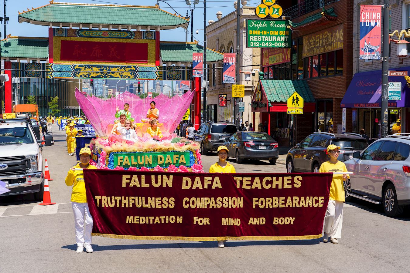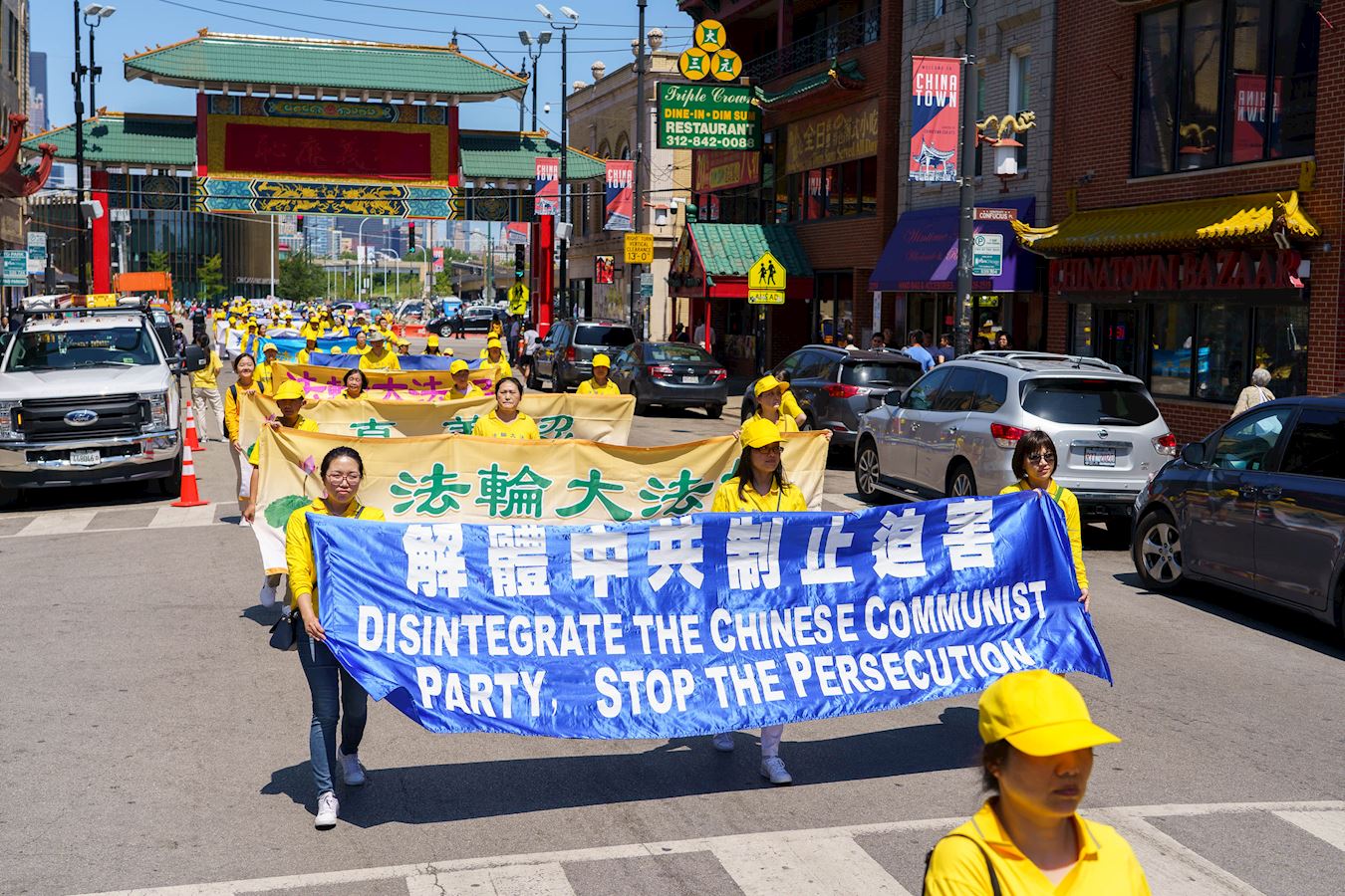 【明慧网二零一九年八月五日】二零一九年八月三日,来自美国中部十一个州,包括密西根州、俄亥俄州、印第安纳州、明尼苏达州、密苏里州、威斯康辛州、肯塔基州、内布拉斯加州、堪萨斯州、爱荷华州和伊利诺伊州的部份法轮功学员,再次聚集在美国第三大城市——芝加哥,并在市中心著名景点——中国城,举行了反迫害二十年主题游行,呼吁制止中共对法轮功长达二十年的残酷迫害。法轮功学员们手持中英文“法轮大法好”、“停止迫害法轮功”和“法轮功和平理性反迫害二十周年”等大型横幅,走上中国城中心的永活大街,穿过著名的华埠广场,向中西方民众传递真相,呼吁制止迫害。