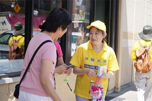 游客海伦(Ms. Helen)女士观看游行,了解了法轮功的功法,感觉功法“非常美丽”,临走时她说:“非常支持(法轮功学员)停止迫害的做法。”