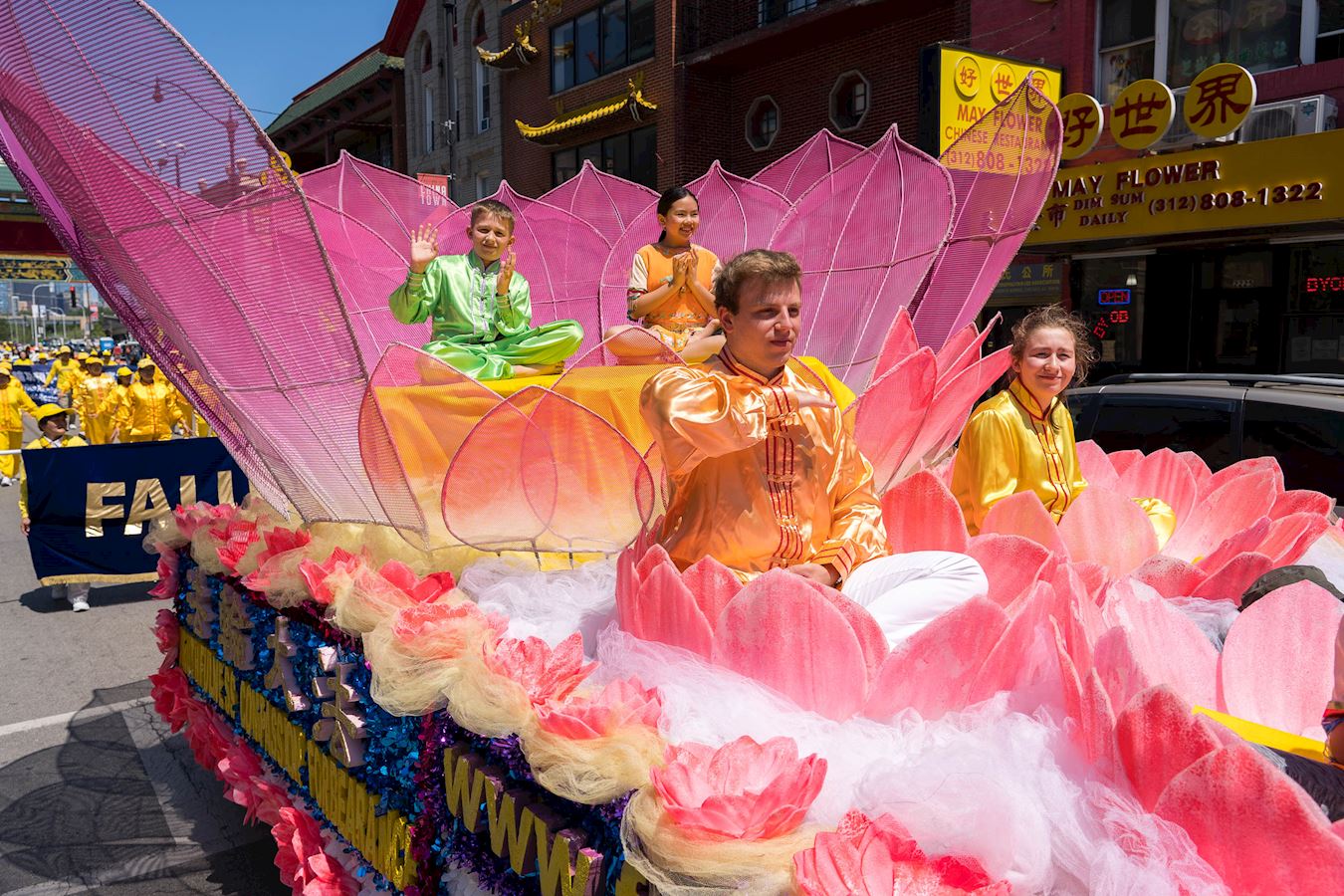 法轮功的大游行包括身着蓝色唐服的旌旗方阵、唐鼓阵、展示功法的花车、炼功方阵、身着白色衣服的悼念方阵、“停止迫害法轮功”主题方阵以及三:退.方阵。中午时分,正是华埠中国城最热闹的时候,晴朗的天空下,法轮功学员的大游行立刻吸引了路旁中西方民众,人们纷纷拍下或摄下壮观的游行。让很多华人惊讶的是法轮功游行方阵里,越来越多的西人加入了法轮功的修炼队伍。