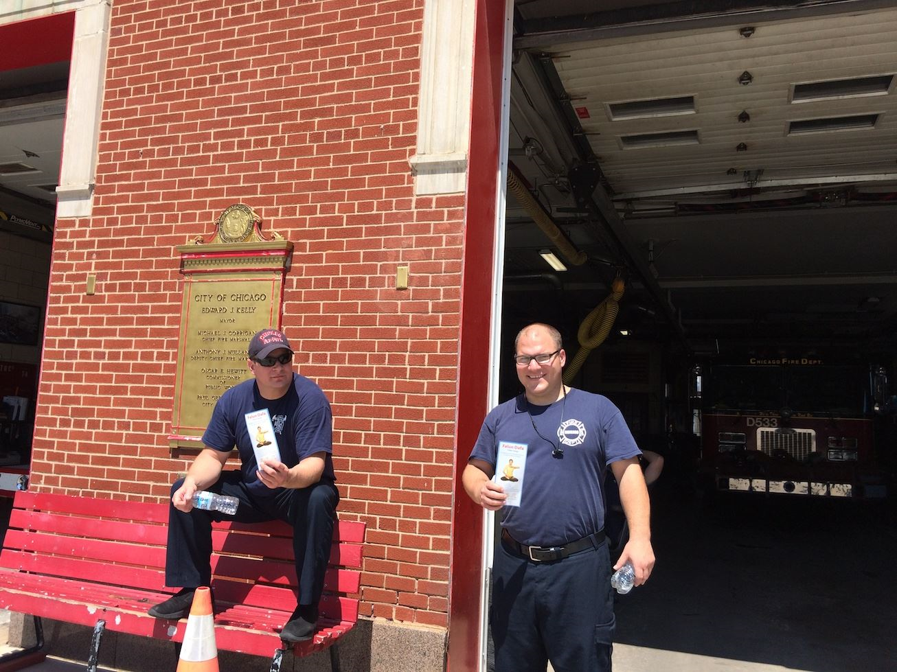 位于中国城的消防局的工作人员也走出来观看游行,表示很愿意了解法轮功功法和受迫害的真相,并手持法轮功真相传单合影。