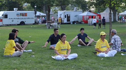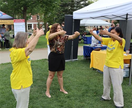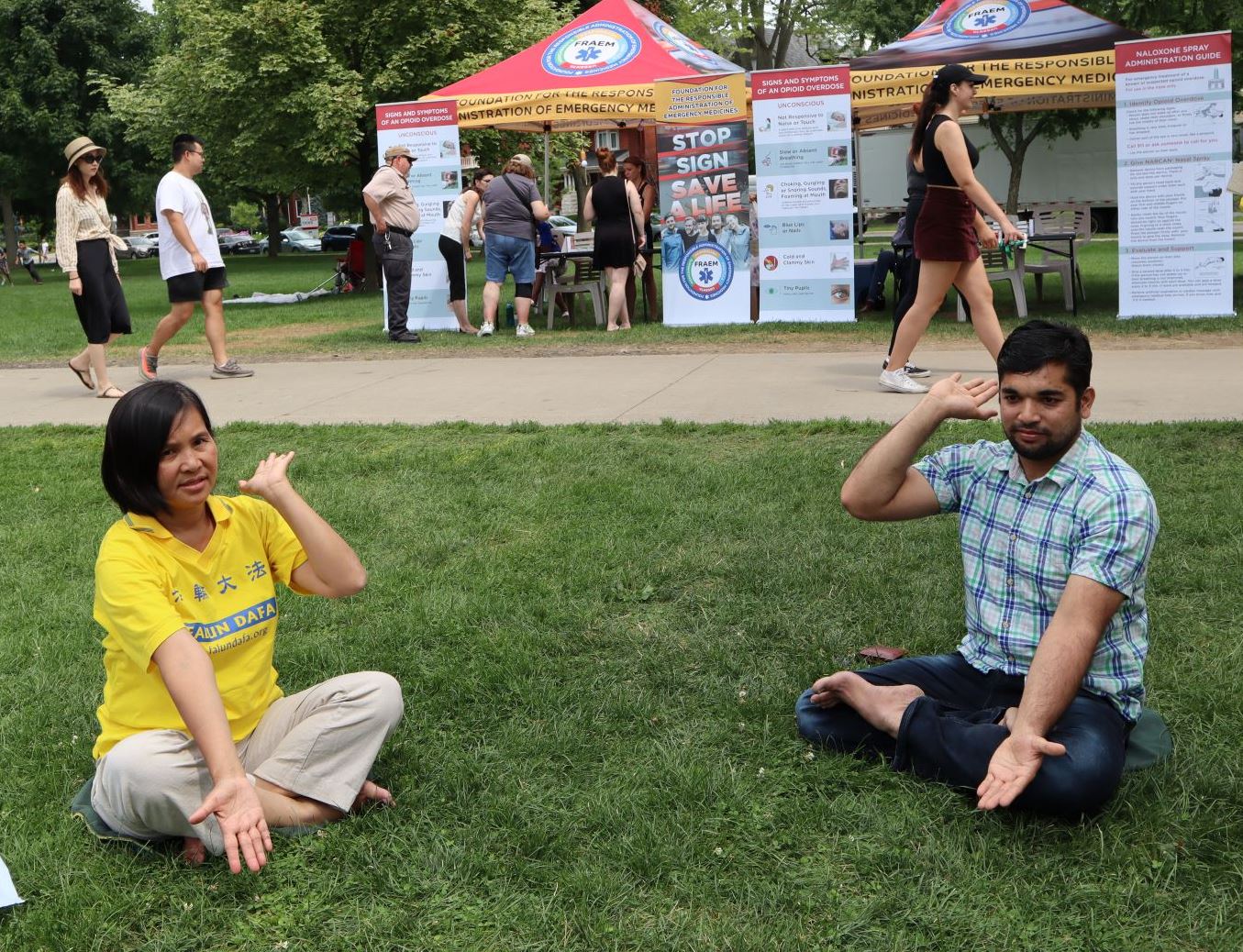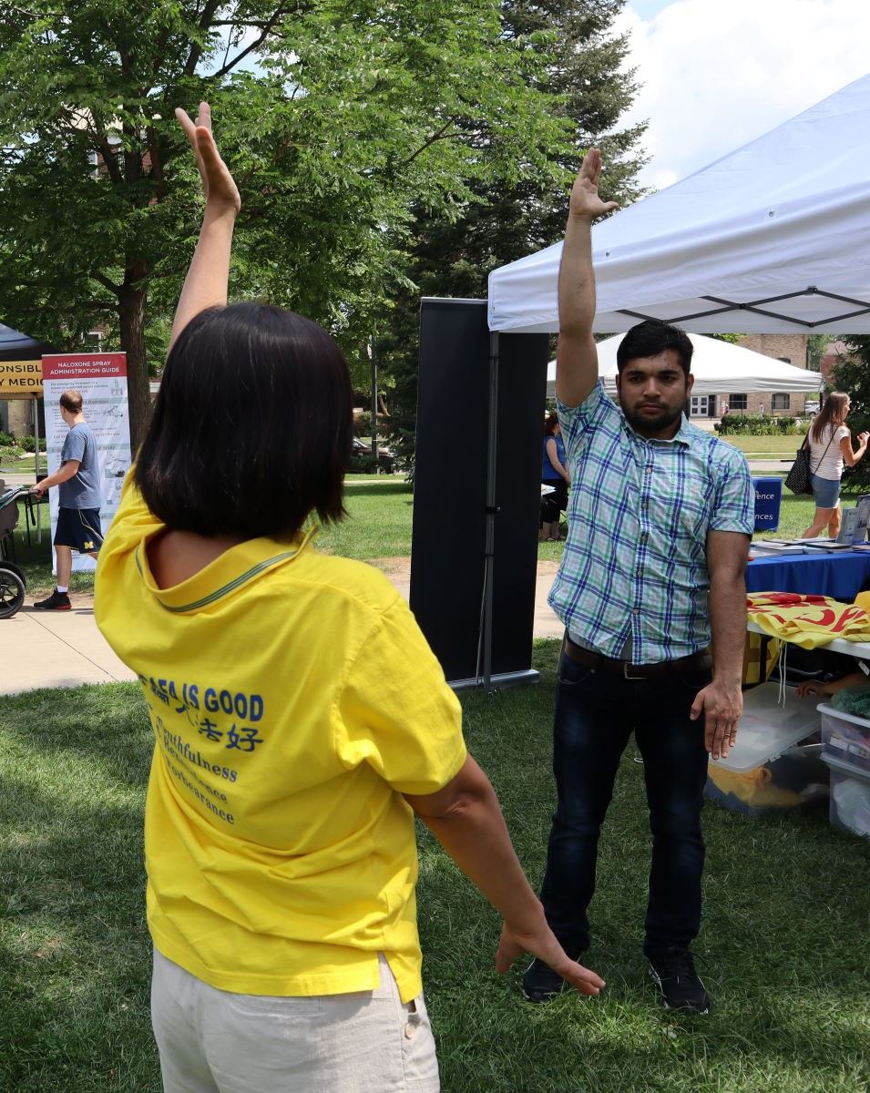 来自印度的移民纳恩(Nahin)先生看到法轮功展位时,表示想学炼五套功法,学员给他演示功法,并详细教他每一套功法的动作。全部学完五套功法后,他表示:“当我在炼第五套功法打坐时,感到全身放松。”