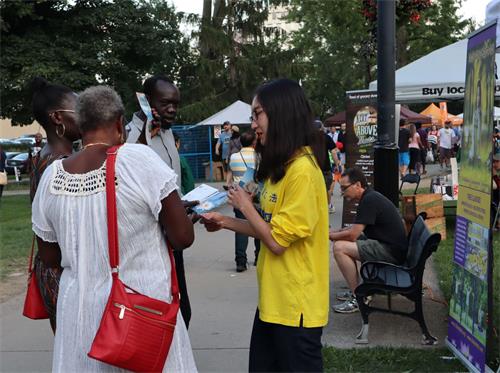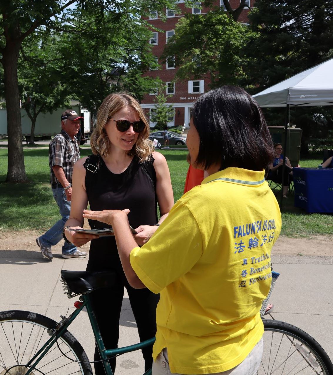 得知在中国大陆法轮功修炼者被迫害的情况,而且这个迫害已经持续了二十年,她表示简直不敢相信。听到中共活摘器官的罪行时,她的表情非常震惊。她在反迫害签名卡上签了名,表示对法轮功学员们的支持。