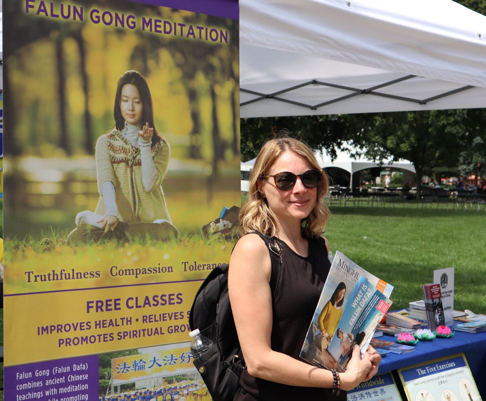 艾琳(Erin)女士居住在当地(伦敦),她经过法轮功学员的展位时,被平静的炼功动作所吸引,驻足观看。她听完学员关于功法的介绍,她觉得非常好,并且表示出浓厚兴趣想要了解更多。她表示: “我回去会再进一步了解,和联系人联络,时间允许的情况下,去集体炼功点学功、炼功。”
