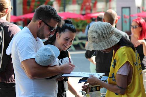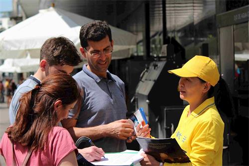 在当天的活动中,法轮功学员设立的展位成了一道特殊的景观,吸引了很多路人。有的路人还未走近,就被学员在闹市中安静祥和的功法演示所吸引;有的驻足观看法轮大法弘传世界各地的照片;还有的则惊讶地看着揭露中共活摘器官罪行的展板……有的在学员和他们短暂的交谈后就签名要求制止迫害法轮功;有的和学员长时间交谈,了解更多的讯息;有的在得知有不同诉求的征签表时,爽快地说,我都签!还有的询问炼功点的时间、地点,打算去学炼功法……