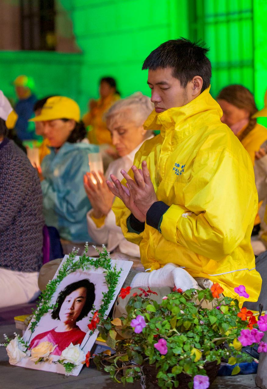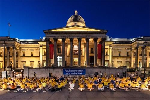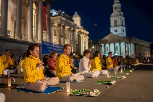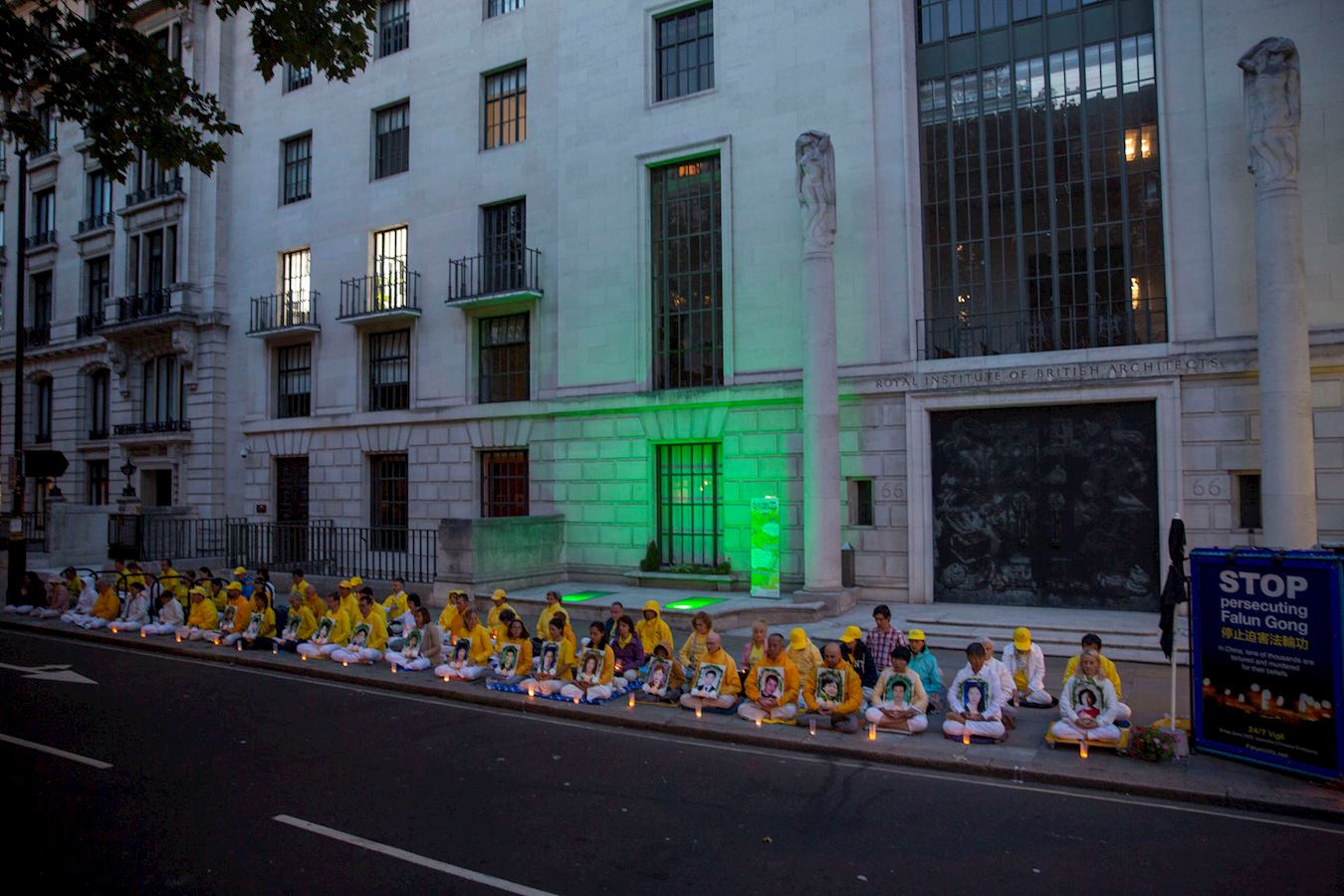 八月三十日晚中共伦敦大使馆对面,夜幕下前来英国参加欧洲法会的法轮功学员点起了烛火,通过打坐炼功的方式,抗议中共对修炼真善忍的法轮功学员长达二十年之久的迫害。