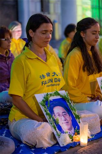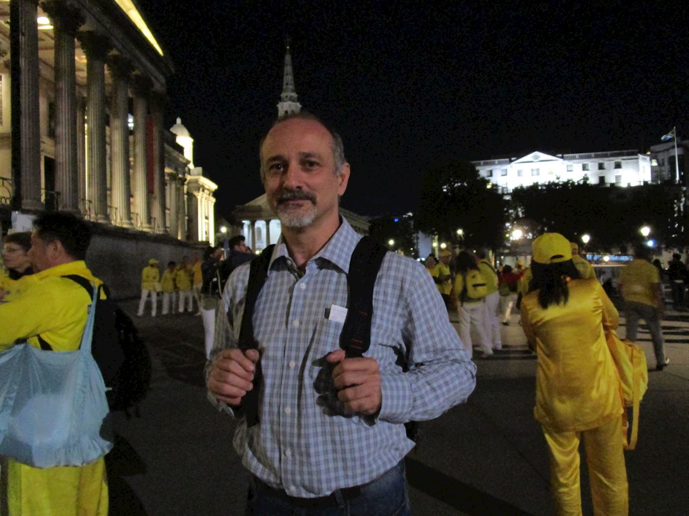 从巴西圣保罗到英国参加航空科学会议的大学教授马塞洛(Marcello)在特拉法加广场巧遇法轮功学员举行烛光守夜活动。