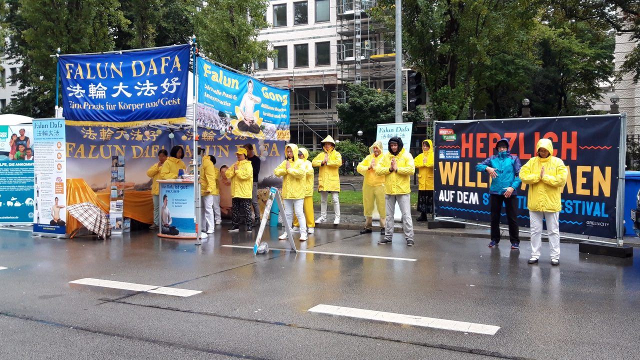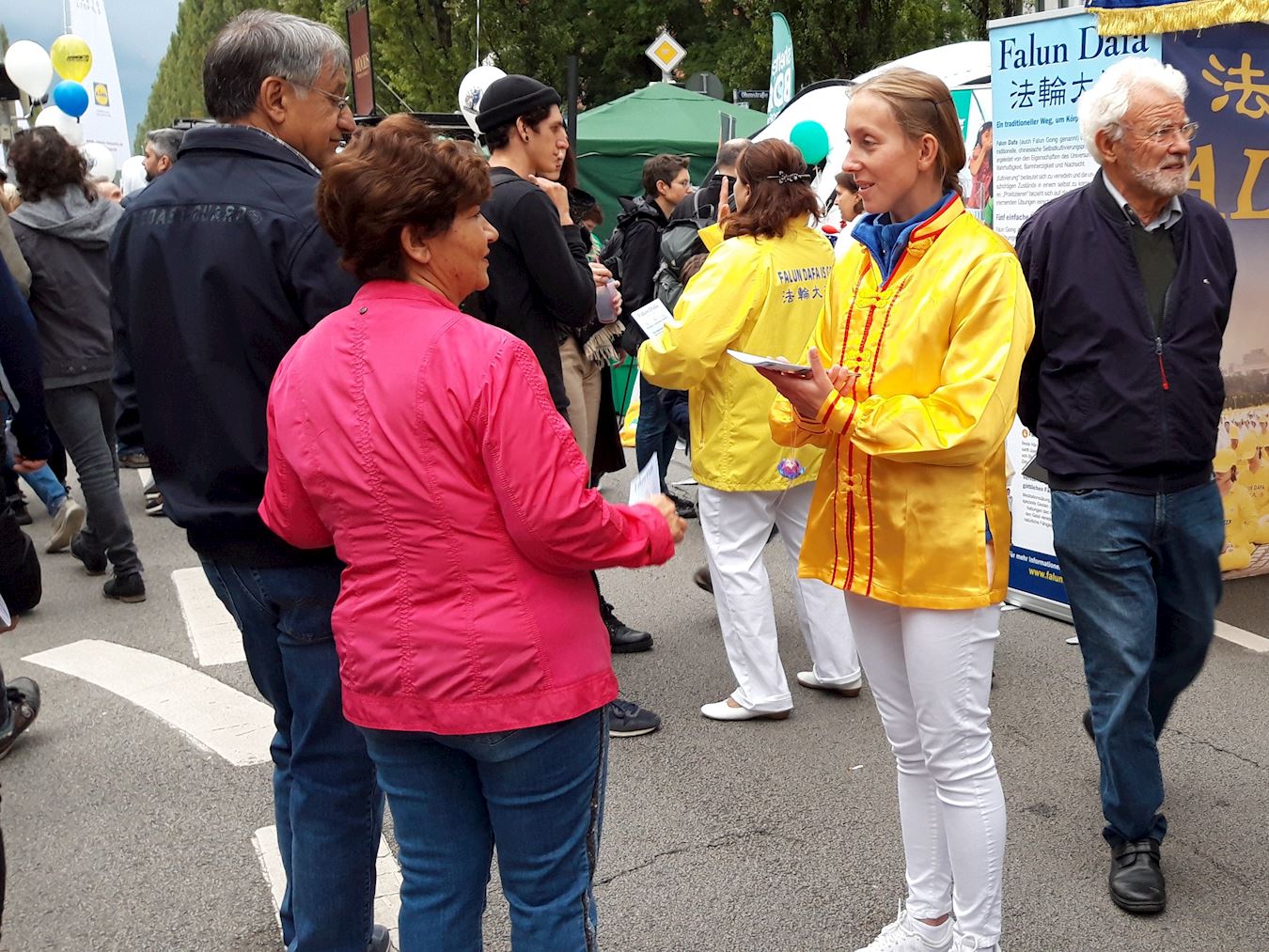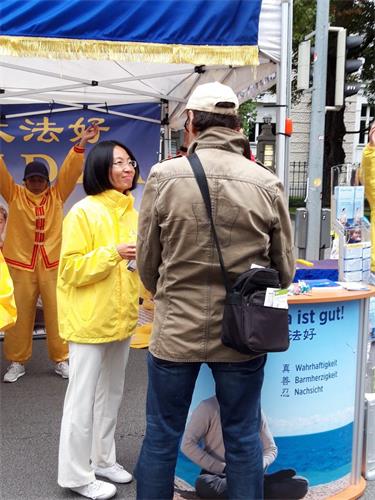 城市节活动正式开始之后,法轮功学员展示了功法,吸引很多慕尼黑民众驻足观看,并跟学员交谈,了解什么是法轮功,如何修炼、修心性等。得知法轮功在中国无辜受到中共的迫害,不少人签名声援法轮功学员。