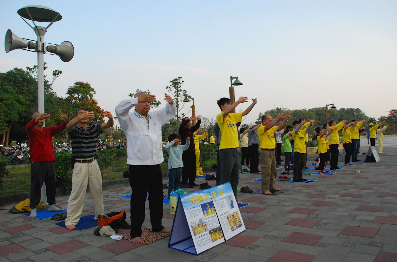 ![]() 图1:法轮功学员在台湾嘉义香湖公园集体炼功 |