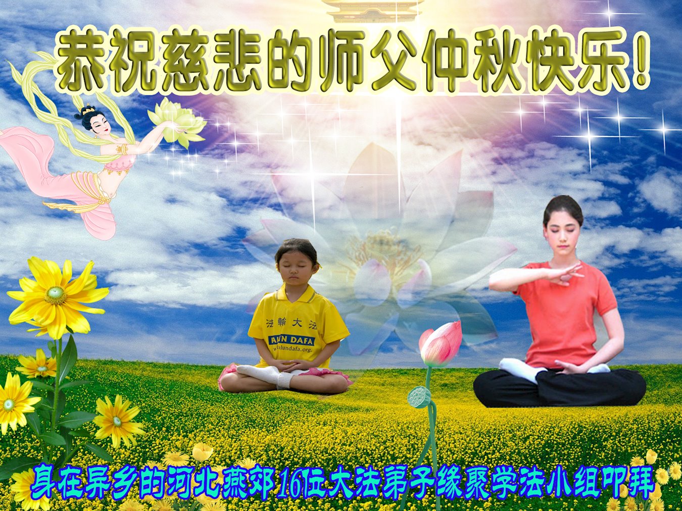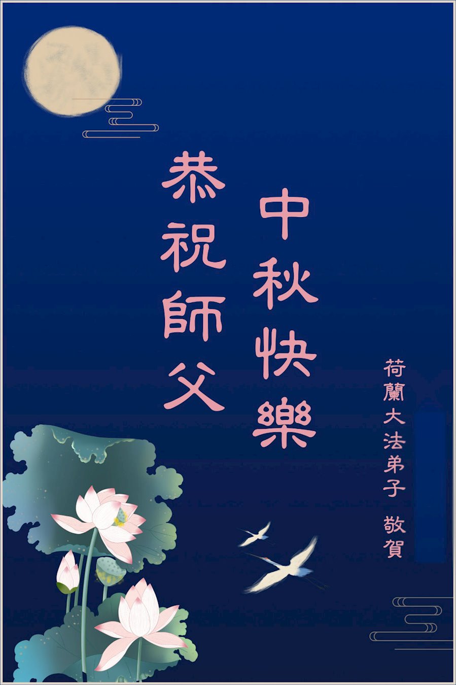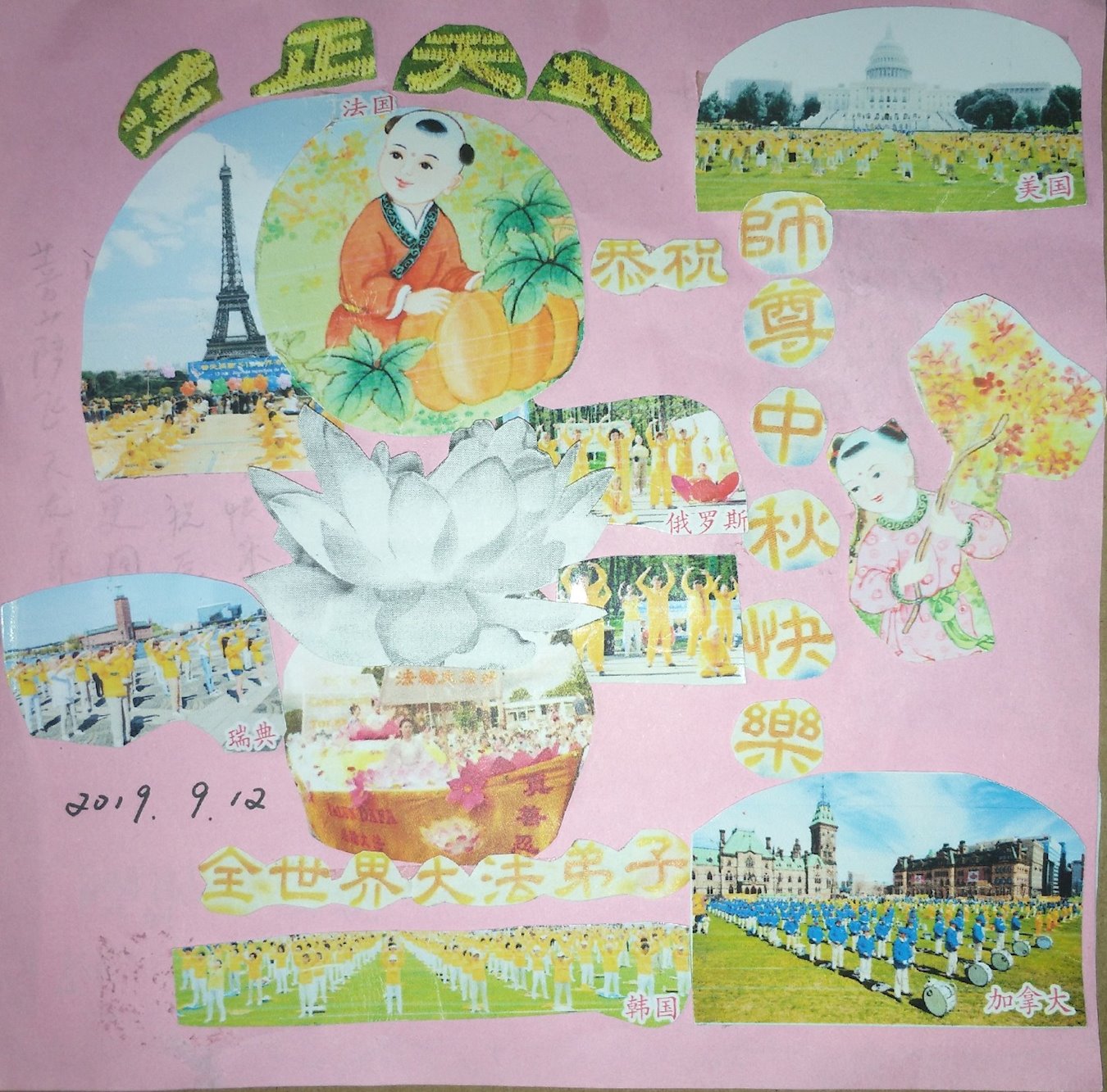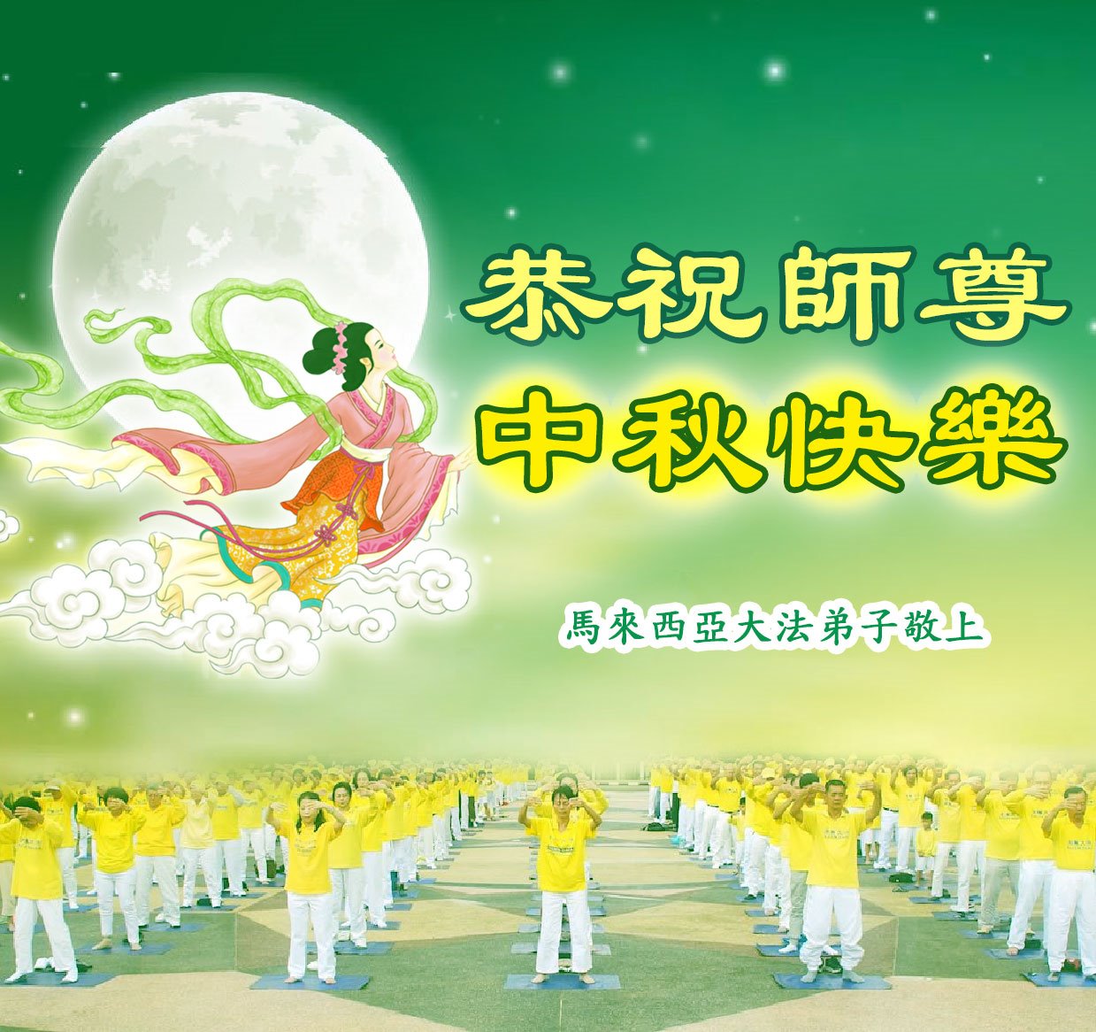 您好!今年的中秋佳节到来了。法国大法弟子在这个敬谢神恩的传统节日里向师尊问好,无限感恩师父的慈悲苦度,恭祝慈悲伟大的师父中秋快乐!