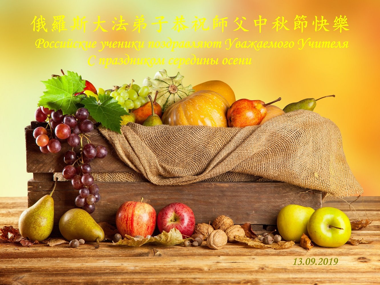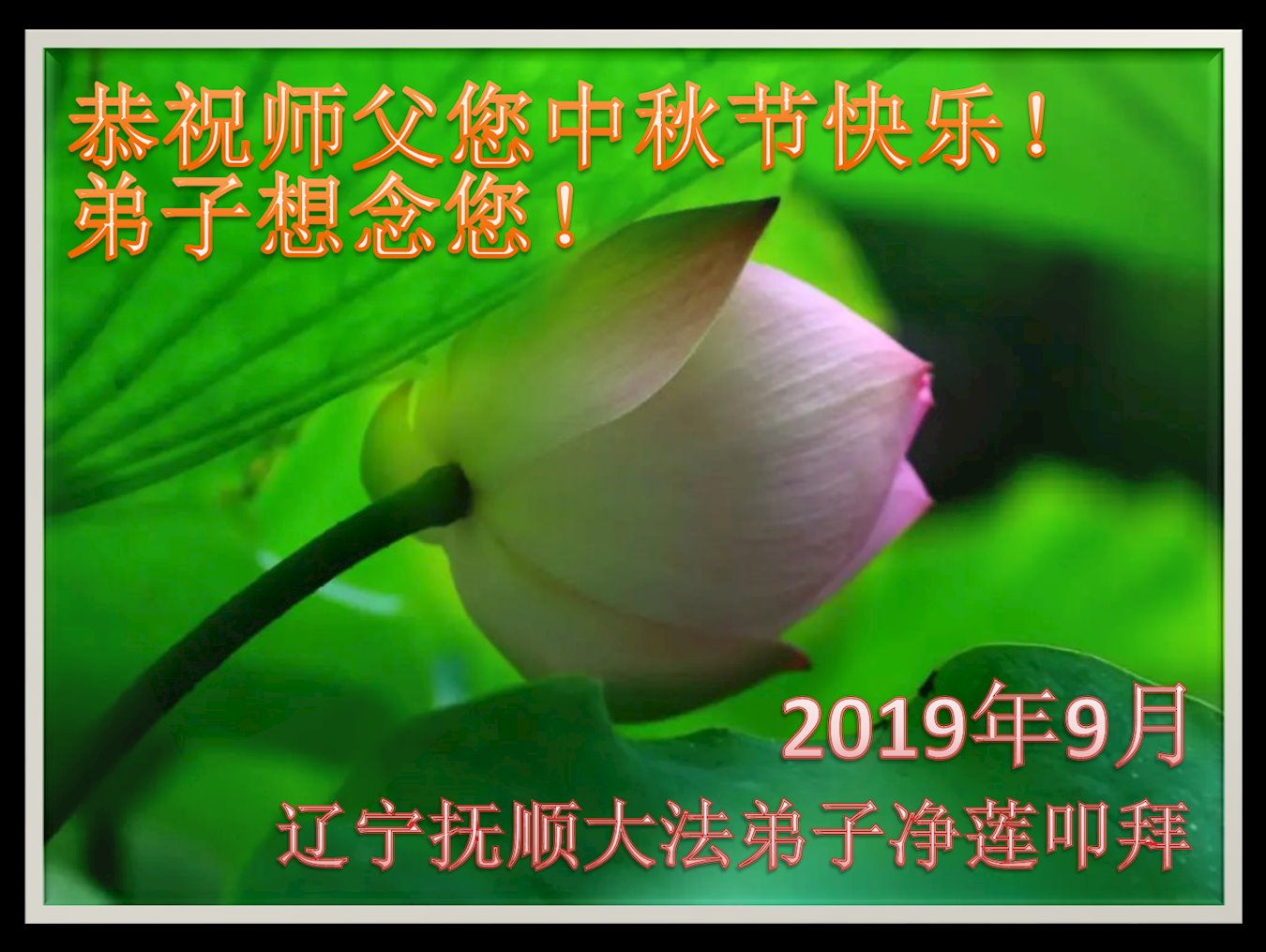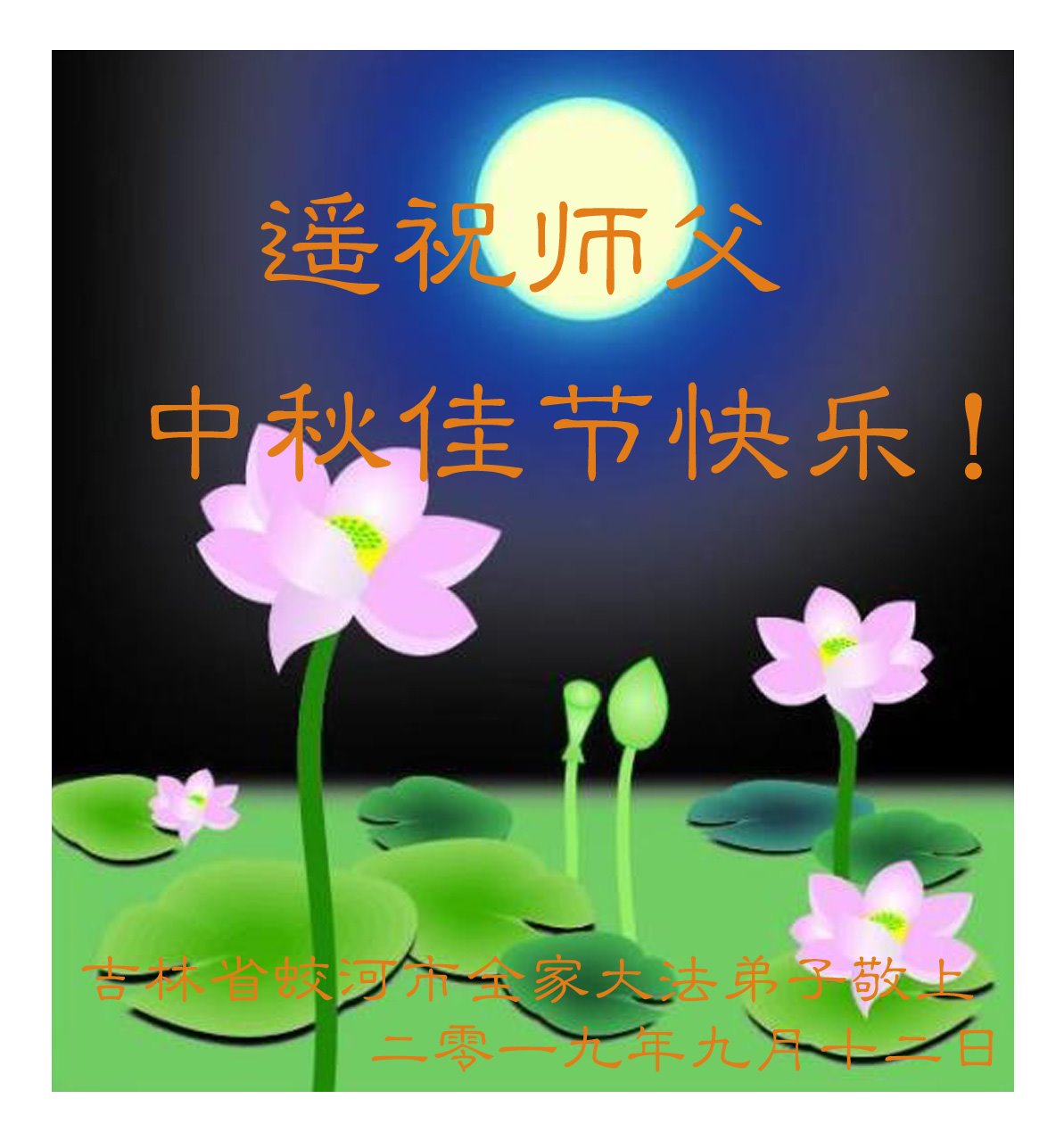 莫斯科大法弟子2019年中秋节向慈悲伟大的师尊问好!感谢师尊慈悲救度!师尊您辛苦了!莫斯科大法弟子叩谢师尊慈悲救度,值此佳节,更加想念师尊,恭祝师尊中秋快乐!中秋朗月松间照,感恩师尊心操劳,为救众生免煎熬,慈悲普度得再造。
