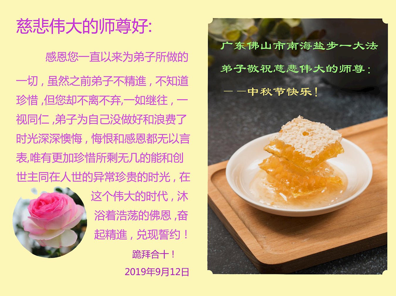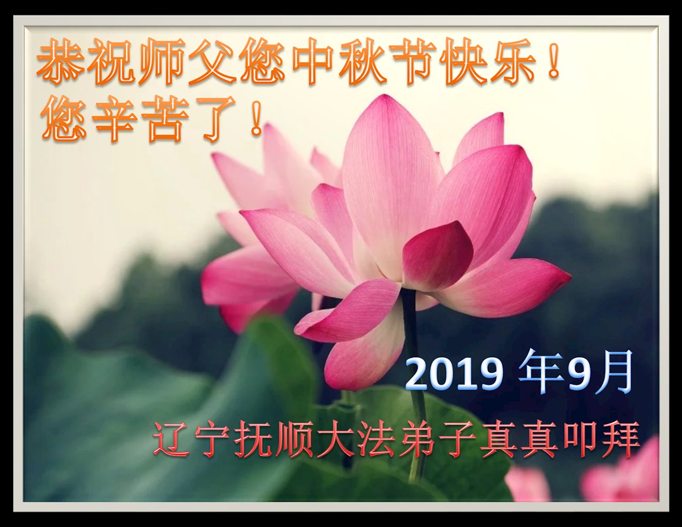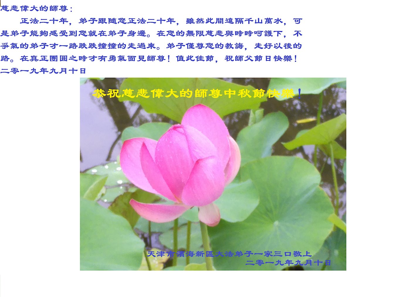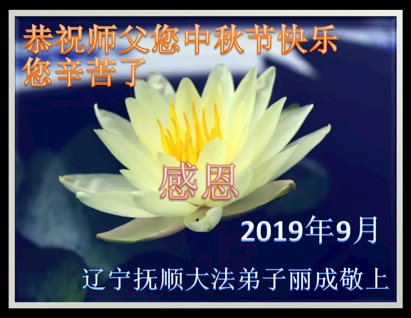 您好!迎来二零一九年中秋月圆,弟子感恩师父给予的作为大法弟子的荣耀和福气!在修炼中走过的艰难岁月,一刻也没有离开过师父的慈悲保护!弟子得到最好的,一切都是源自于慈悲伟大的师父!