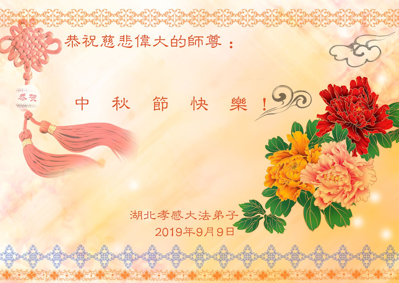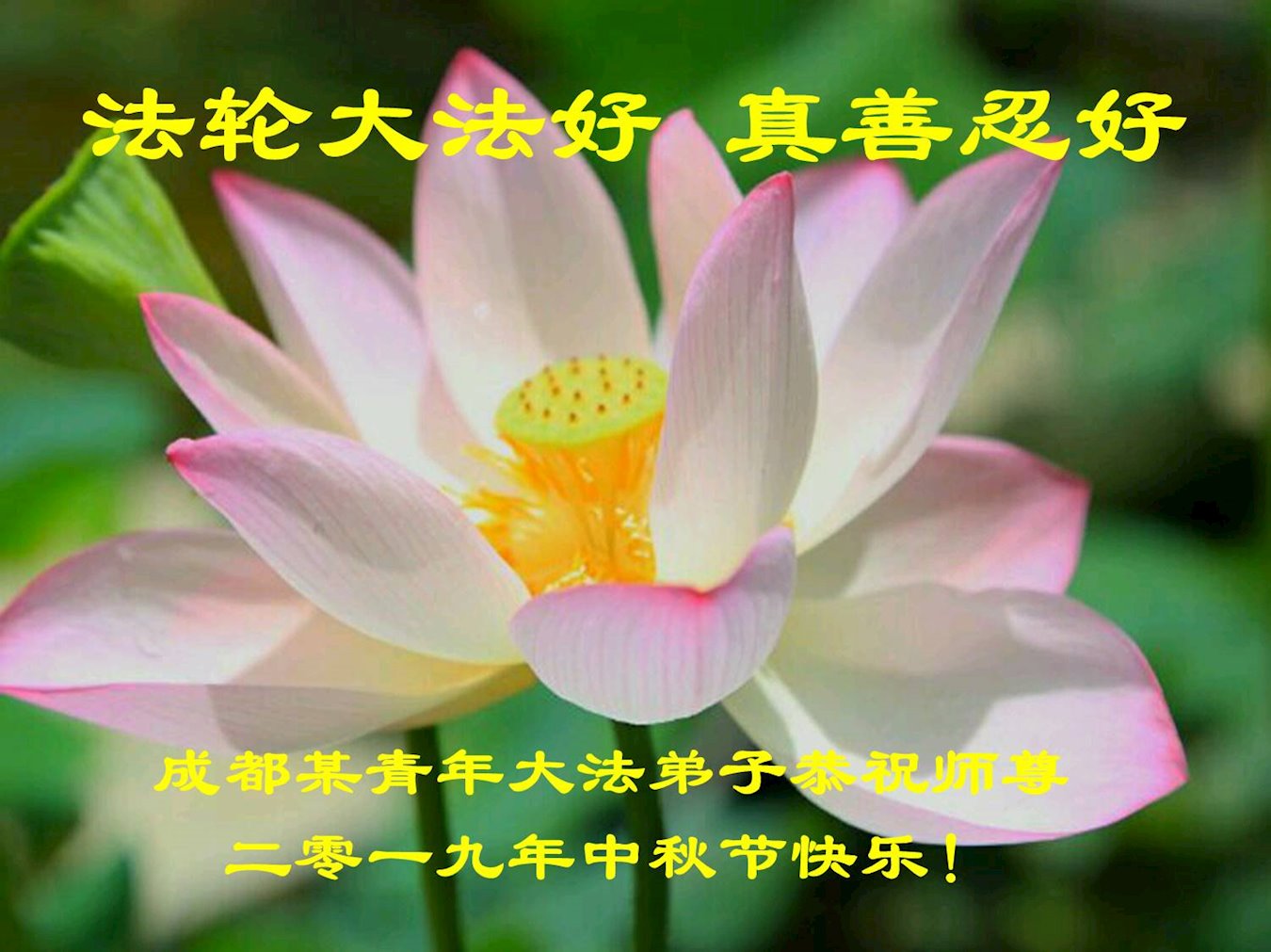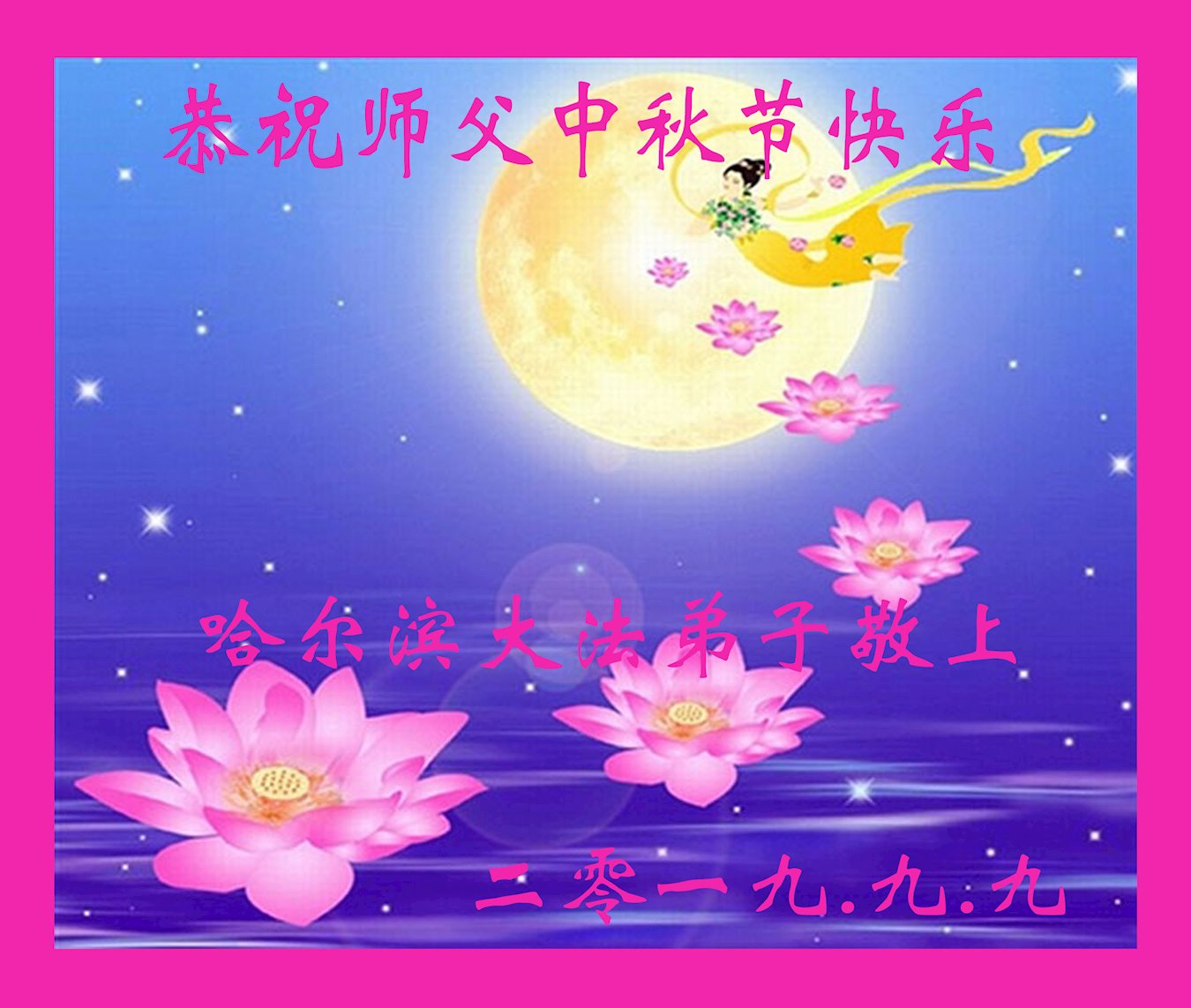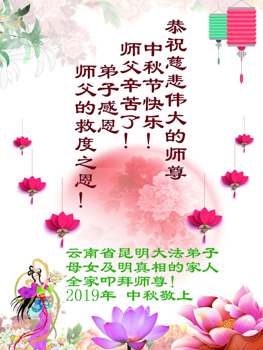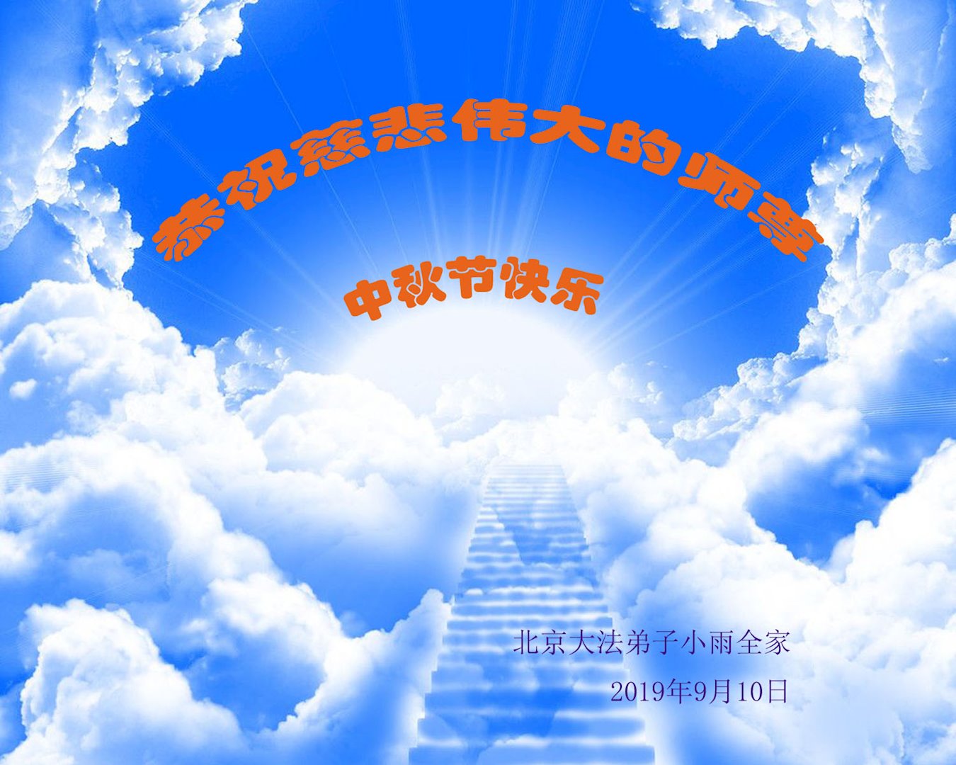 您好!迎来二零一九年中秋月圆,弟子感恩师父给予的作为大法弟子的荣耀和福气!在修炼中走过的艰难岁月,一刻也没有离开过师父的慈悲保护!弟子得到最好的,一切都是源自于慈悲伟大的师父!