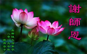 师父为弟子付出的一切辛劳,弟子无限感恩,无以言表!唯有精進修炼以报师恩,把师父的慈悲传给更多的众生,让他们都能从谎言中清醒过来,明白真相,找回自己,不辜负师父的佛恩浩荡!