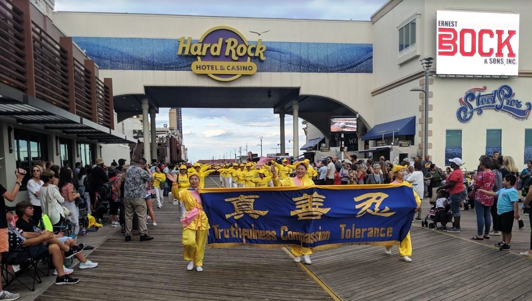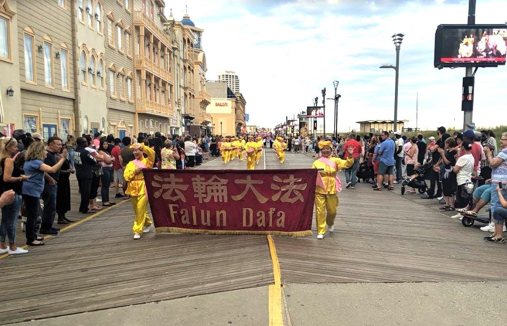 大西洋城警察汽车引领头阵,花车、彩旗、军乐队、哥伦比亚小姐、大西洋城警察荣誉守卫队、海军护卫队、前大联盟棒球队、前职业足球运动员队、前飞行员队、911纪念旗帜方阵、州立大学、斯坦顿大学、新泽西州警察……近百个游行队伍服装明艳,浩浩荡荡。法轮功队伍第四十九个出场。