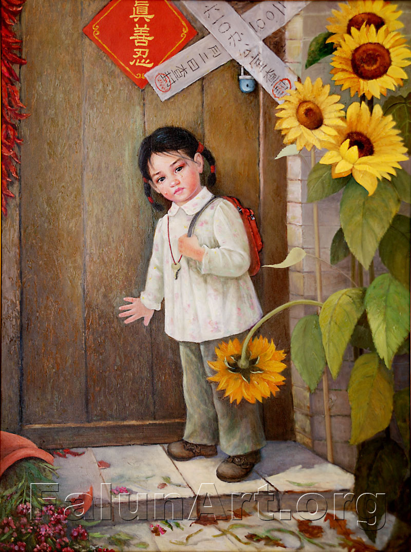 在“真善忍国际美展”里,有一幅画,叫“无家可归”:一个小女孩放学回家,却被关在门外,没人给她开门。