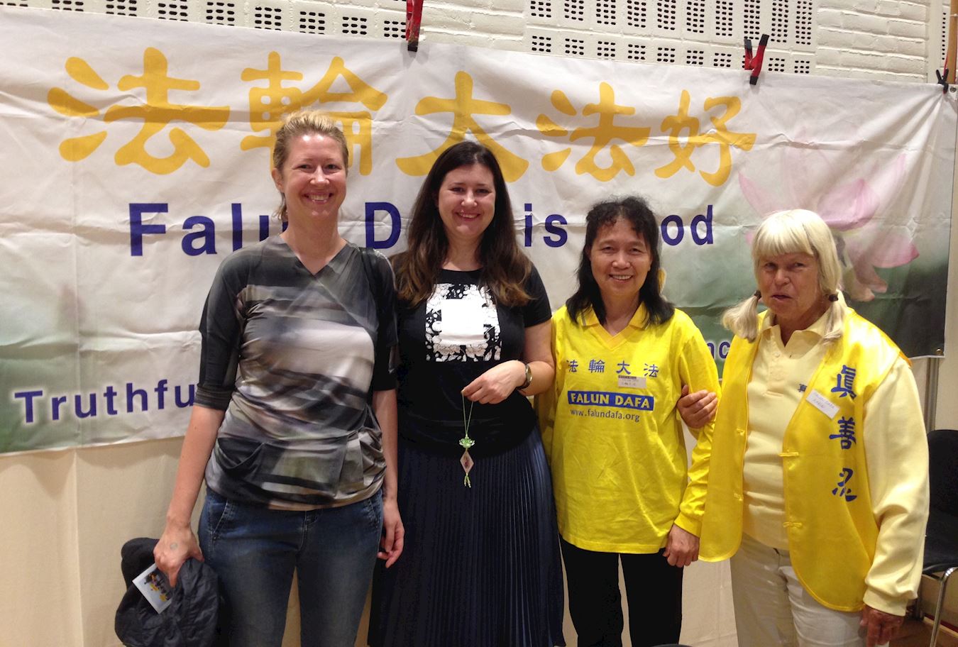 悠扬的炼功音乐和舒展的功法吸引参观者驻足,碧吉特(Birgit)和埃米莉(Emilie)女士来到展位前,学员向她们介绍了法轮功是遵循“真善忍”原则修炼的功法,很多人炼法轮功后达到内心的宁静和身体健康,然后他们又告诉更多的人,人传人,心传心,现在全世界有一百多个国家和地区上亿人炼。碧吉特高兴地说:“我感受到法轮功祥和的能量场,很舒服。”学员邀请她们:“想学功吗?”“好啊!”她们认真学了三套功法,感觉非常好,全身发热,放松。最后她们高兴地和学员合影。