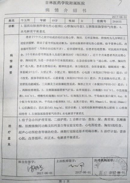 ![]() 牛玉辉的吉林医药学院附属医院病情介绍书 |