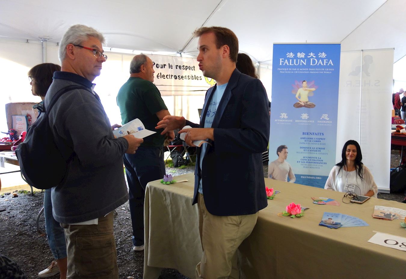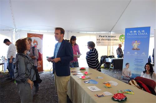 前来询问的人络绎不绝,有人表示已得知法轮大法而希望了解更多,有人迫切地说对打坐很感兴趣,想学炼功法。当得知在蒙特利尔以及魁北克其他主要城市,都有免费义务教功的学员时,人们非常高兴,他们诚心地带走了法轮大法简介,表示要花一些时间去认真了解。