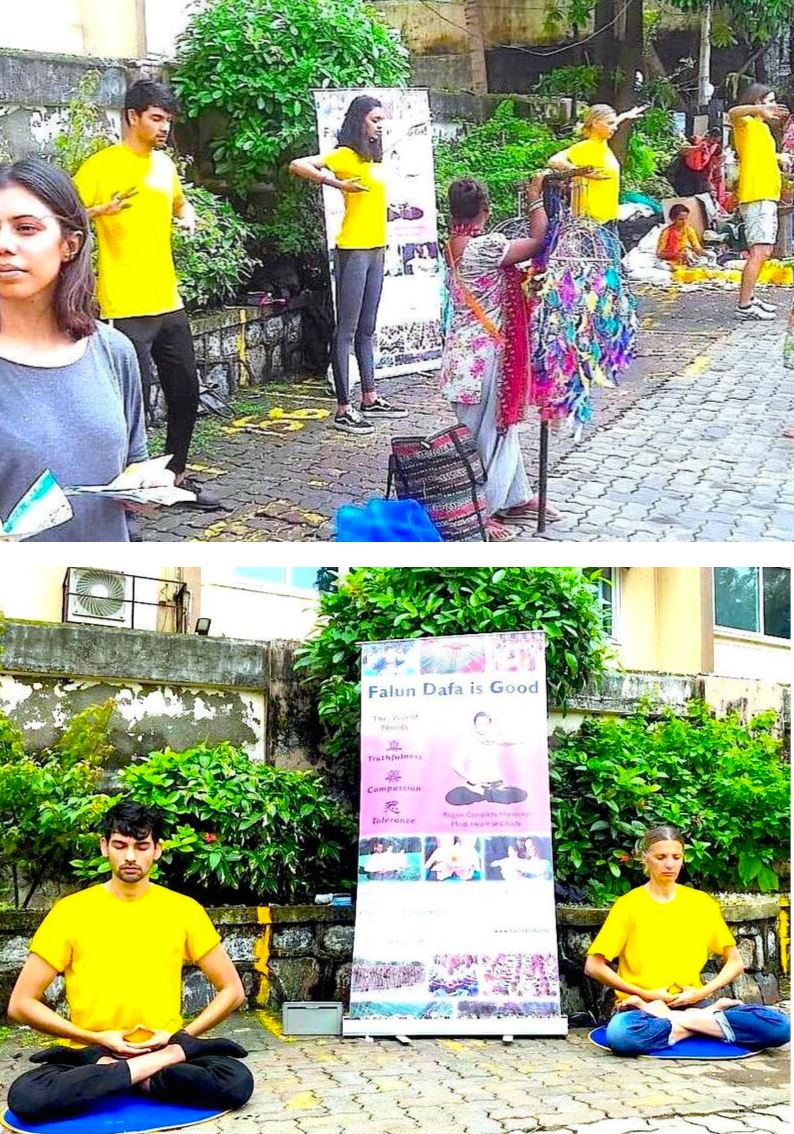 ![]() 图1:孟买法轮功学员在为人们演示功法 |