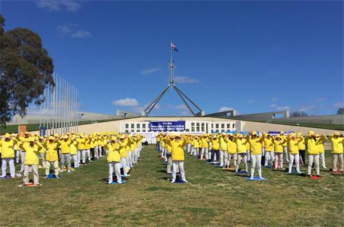 图1~7:二零一九年九月十七日和十八日两天,来自堪培拉、悉尼、墨尔本、西澳珀斯、昆士兰各主要城市以及南澳阿德莱德的部分法轮功学员,在国会山庄前的草坪上集体炼功、展示横幅,并吸引民众驻足了解真相。 |