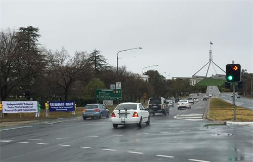 九月十七日凌晨,在经历了前一天日间二十五摄氏度、南半球春天较罕见的高温后,一夜雨雪交加,首都被皑皑白雪覆盖,甚至导致高速公路的交通严重受阻,气温骤降至摄氏零度以下。各地法轮功学员冒着风雨从清晨七点开始,在通往国会山庄的主干道和主要路口,拉起中英文横幅表达诉求。当天过往车辆不时鸣笛,支持法轮功学员展示真相,倾佩法轮功学员无畏的精神和勇气。