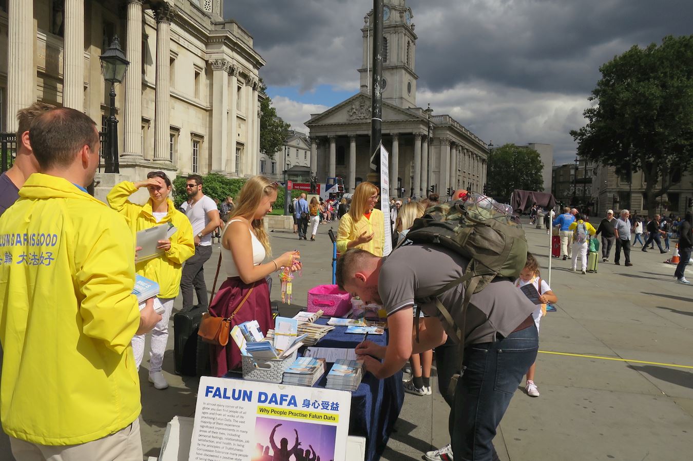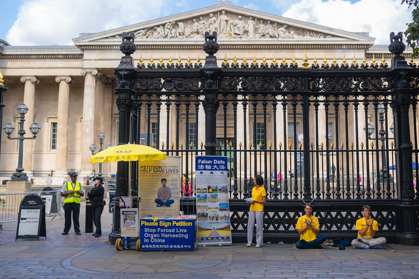 法轮功学员在大英博物馆炼功的场面吸引了中西方游客。他们中的不少人伫足与学员交谈了解真相。当人们了解到什么是法轮功,二十年来法轮功学员反迫害的历程,以及中共为什么要迫害法轮功的真相后,人们感动于法轮功学员和平宁静的炼功场景,震惊于中共迫害法轮功的邪恶,纷纷签名,声援法轮功学员反迫害。