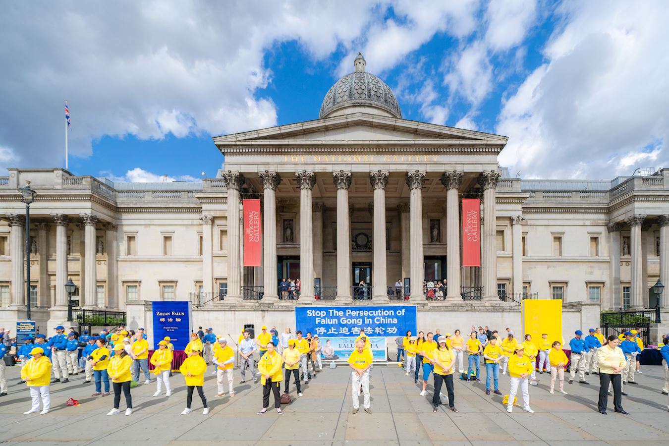 ![]() 图1:九月一日,法轮功学员在特拉法加广场集体炼功。 |