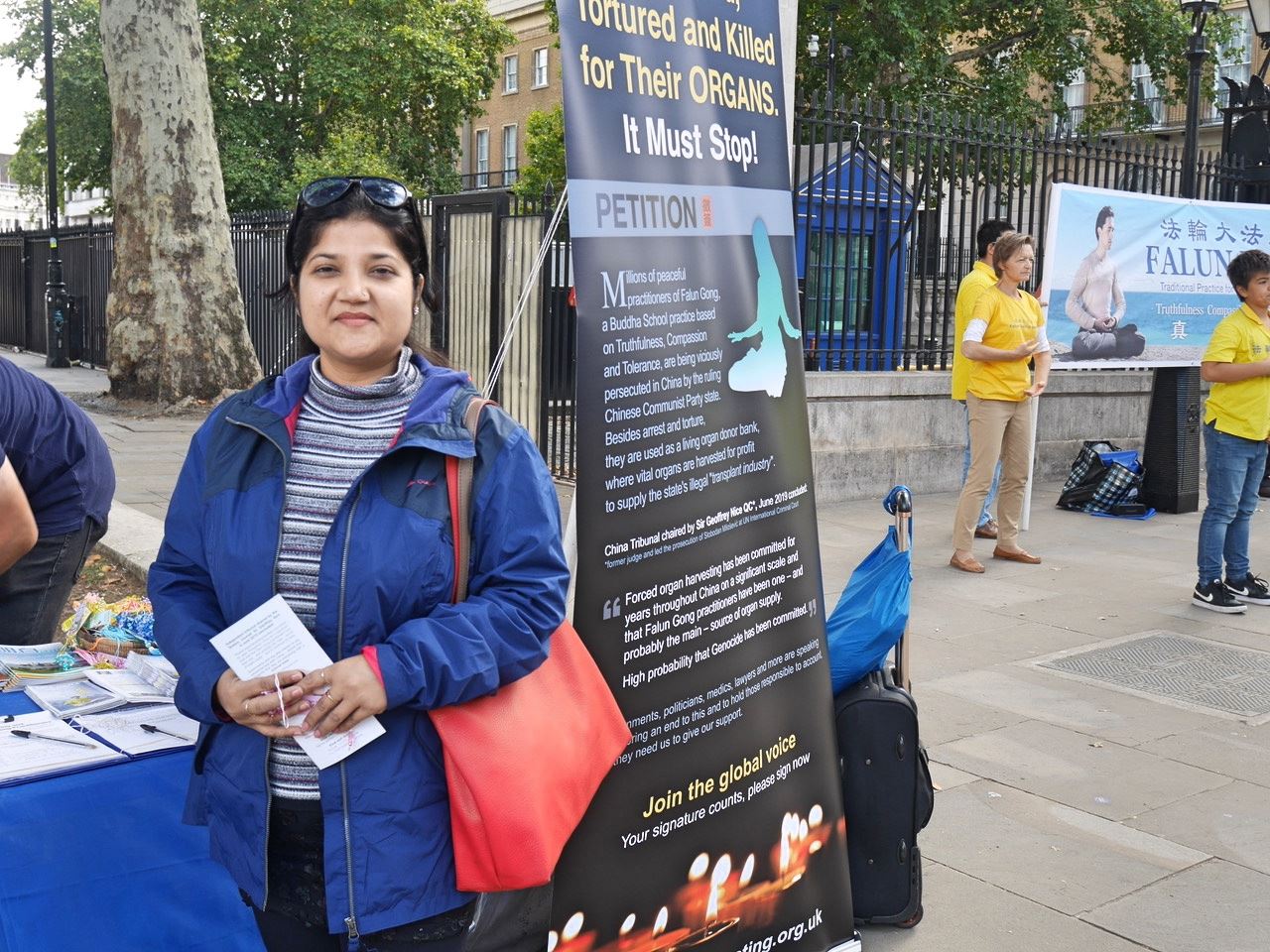 来自印度的波格特女士(Borget)是一名IT工程师,九月一日,她经过唐宁街首相府时看到邂逅法轮功,她了解真相后签名声援法轮功学员反迫害,并说:我觉得在中国发生的事情真的非常残忍。“你们把这件事(中共活体摘取法轮功学员器官)披露出来,真的非常好。”