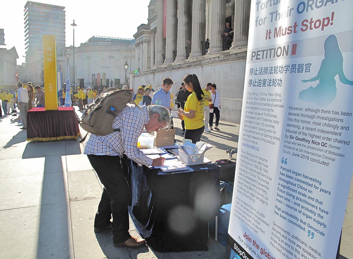 ![]() 图3:在特拉法加广场上,了解真相后的民众纷纷签名声援法轮功学员反迫害。 |