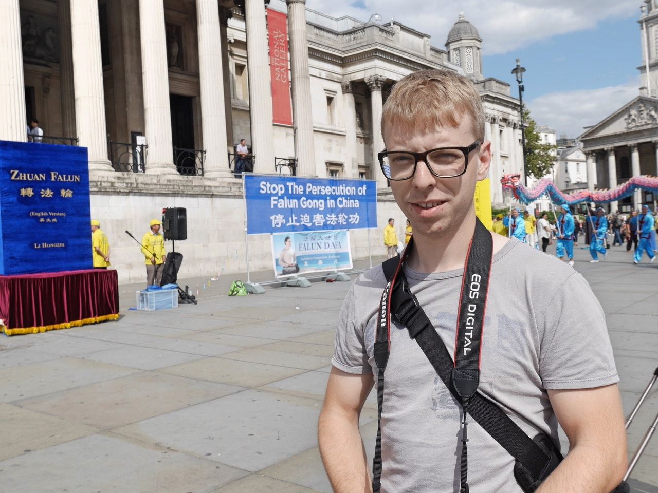 在英国工作的傅先生在鸽子广场逗留了很长时间,观看法轮功学员炼功,之后也欣赏了欧洲天国乐团的表演,他还长时间跟不同的法轮功学员交谈。他很想知道法轮功学员修炼的目的是什么。过去他也看过《转法轮》,但看不太明白。看着法轮功学员炼功的场景,他说:“至少我看下来,大家(法轮功学员)都比较友善,比较和平,这是我比较欣赏的。”