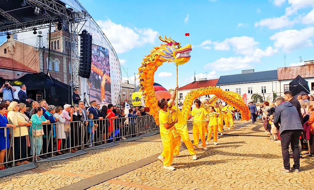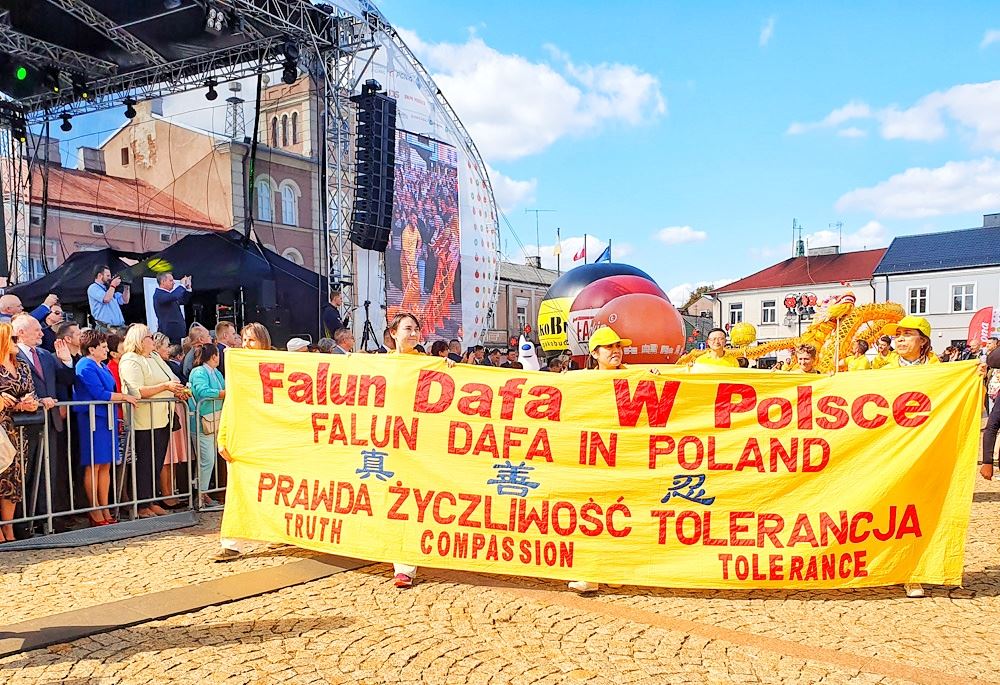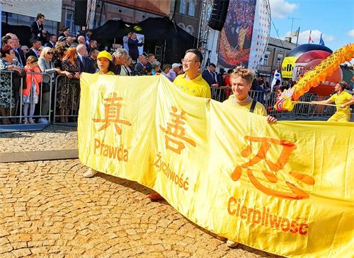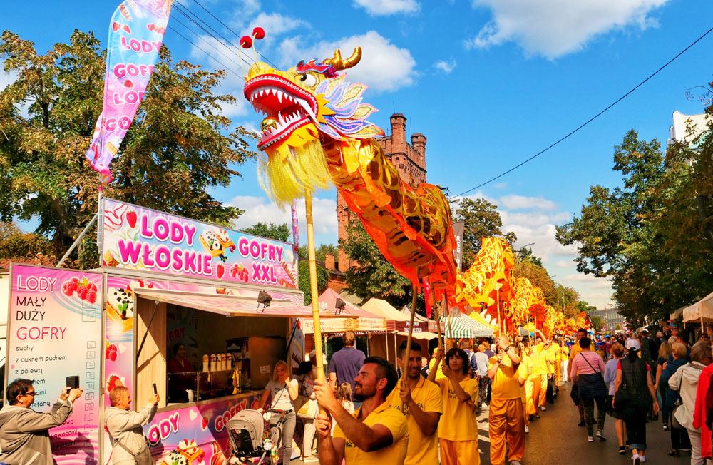 波兰法轮功学员组成的舞龙队为丰收节带来了一条长达四十多米长的金龙,二十一人同时舞动,阳光下金光闪闪,活灵活现,现场观众叹为观止,掌声阵阵。队伍前面学员手持条幅“法轮大法在波兰”、“真善忍”、“法轮大法好”,街道两旁,法轮功学员沿途发放传单,很多人认真阅读。