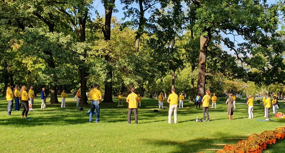 法轮功学员在游行和开幕式结束后,来到环境幽雅的城市公园集体炼功,吸引了很多过路游人的观看,拍照。