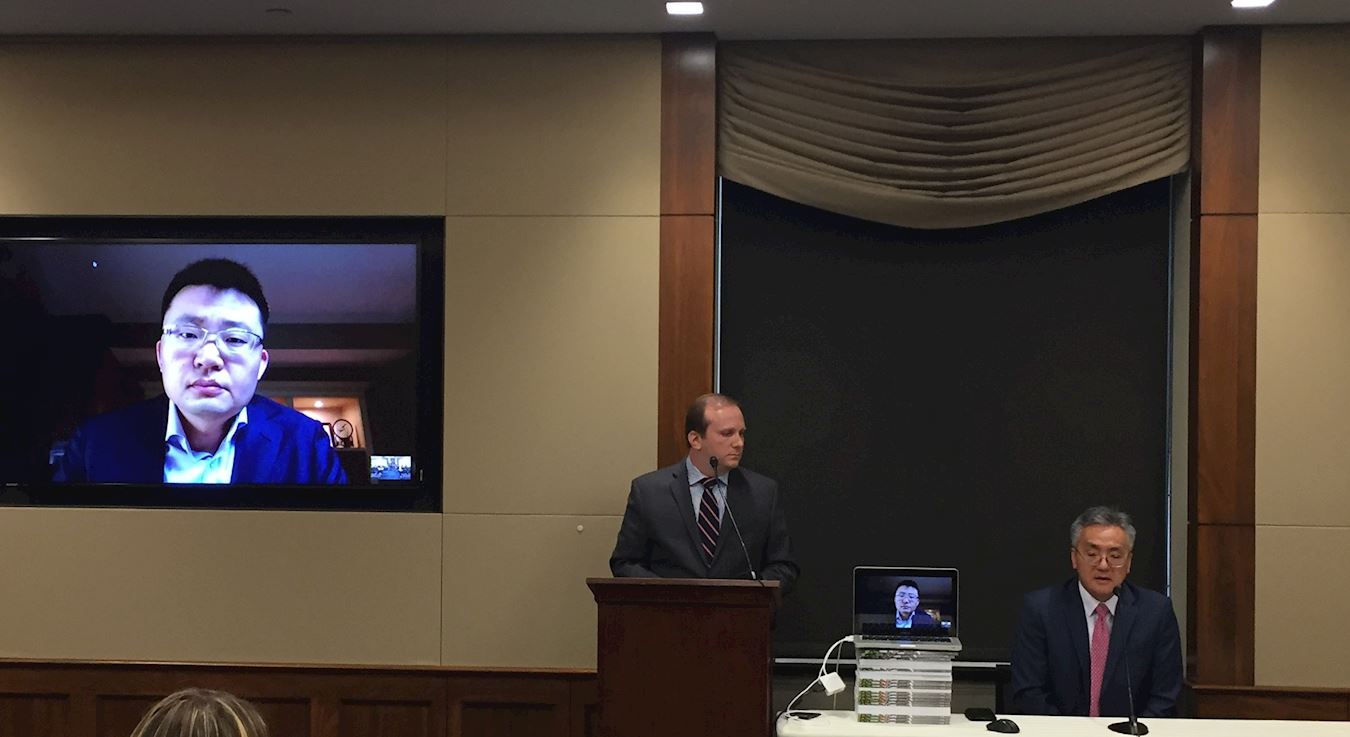 ![]() 图2:导演李云翔(Leon Lee)(视频)、放映会主持人埃里克·梅尔策(Eric Meltzer)(中)和华盛顿DC法轮大法学会发言人刘宁平(右)在影片放映后回答观众问题。 |