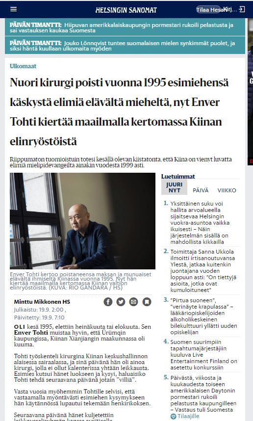 ![]() 图1:芬兰畅销全国具有最大影响力的报纸《赫尔辛基日报》关于“中共掠夺器官研讨会”的报道网络版 |