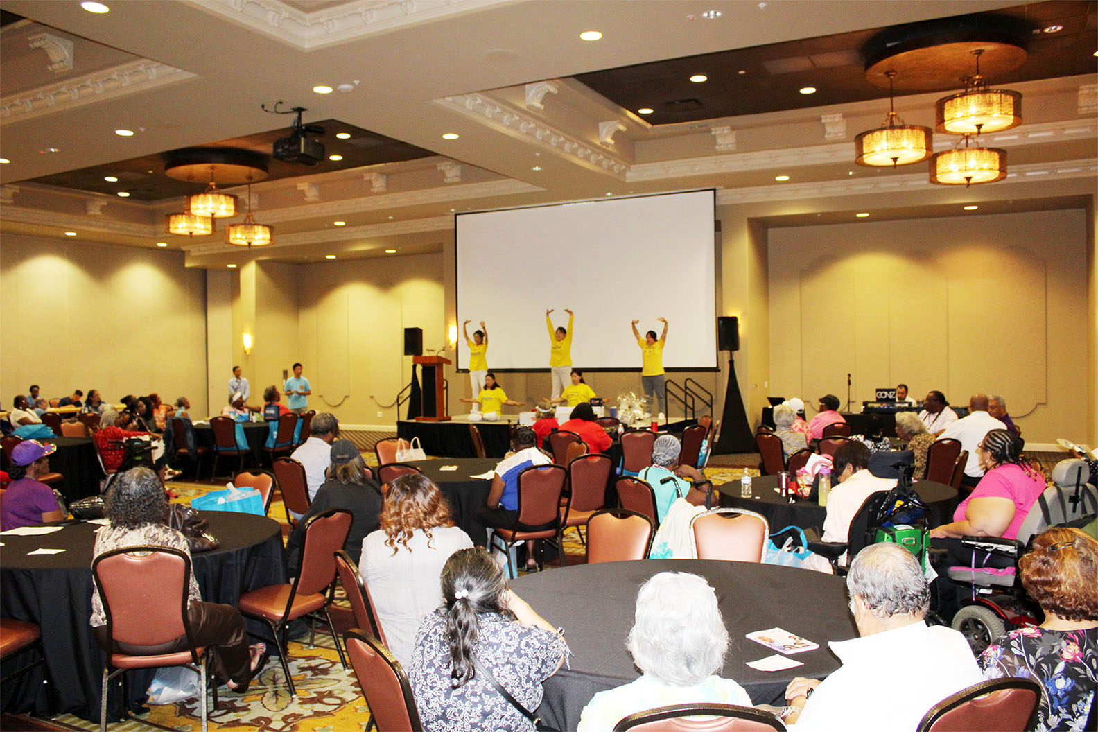 ![]() 法轮功学员在海湾地区活动中心年长者健康展览会上展示功法 |