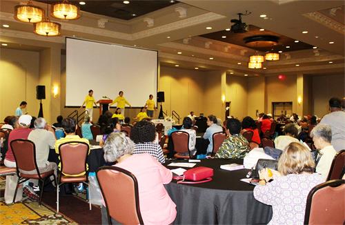 上午十一点四十五分,法轮功学员被邀请在舞台展示法轮功功法,法轮功学员宋先生首先介绍了法轮功,随后法轮功学员开始炼功,台下的观众被法轮功的功法深深吸引着,主办方录像,以及一些观众拍下了学员炼功的照片,并以掌声表示赞赏和感谢。