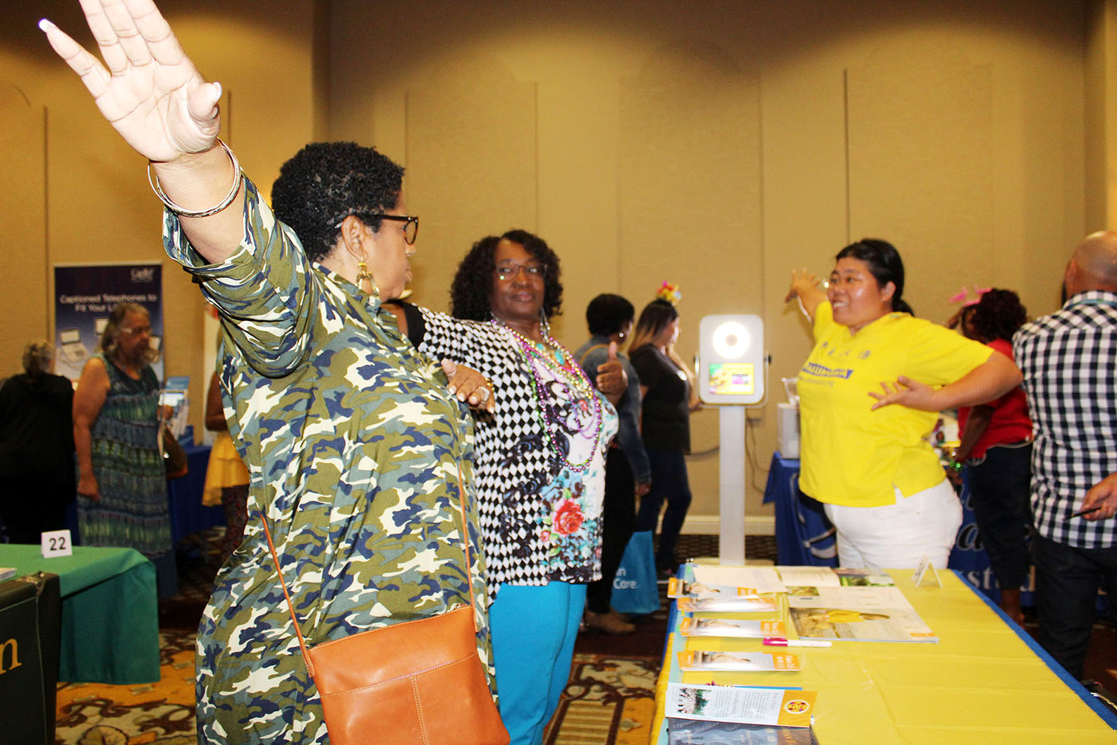 从上午十点钟开始,年长者陆续进入展览会,法轮功学员的展位的桌子上面摆放着英文版的李洪志先生的著作《转法轮》以及《法轮功》,《明慧国际》,弘法传单,当地炼功点地址,各种色彩的手工制作的小莲花,两个介绍法轮功的竖式活动横幅,川流不息的人群经过了法轮功学员的展位前驻足观看,观众获得了真相传单以及小莲花,一些观众拿取了学功的资料,不停的有参观者询问:“法轮功很好”,“在哪学功?”“请到我们机构介绍法轮功。”法轮功学员忙忙碌碌不停地向观众介绍法轮功。
