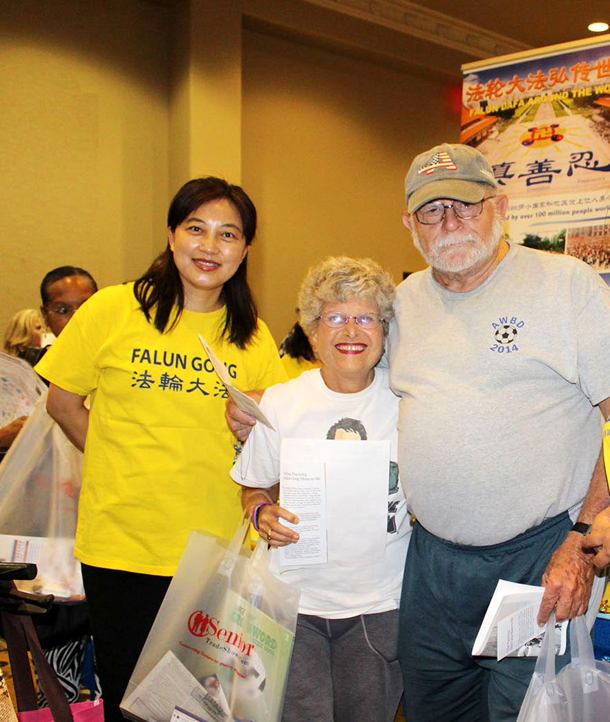 就在下午四点结束之际,观众乔伊(Joy)女士对法轮功仍留恋不舍,想要让自己的知友学法轮功的机会,她在现场向周边展位她的两位知友介绍法轮功,很快,她的知友立即索取国际明慧周刋,想要深入了解法轮功。