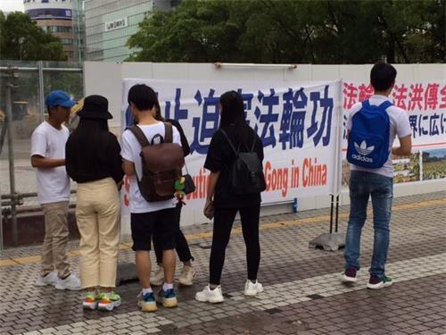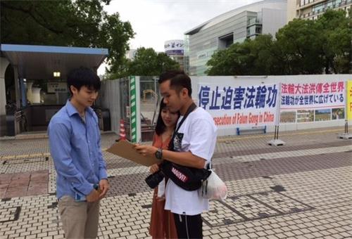 在签名的人们中,有很多三五成群结伴来名古屋游玩的越南研修生,在听讲越南语的法轮功学员介绍详细情况后,很多都签了名,谴责中共的暴行。