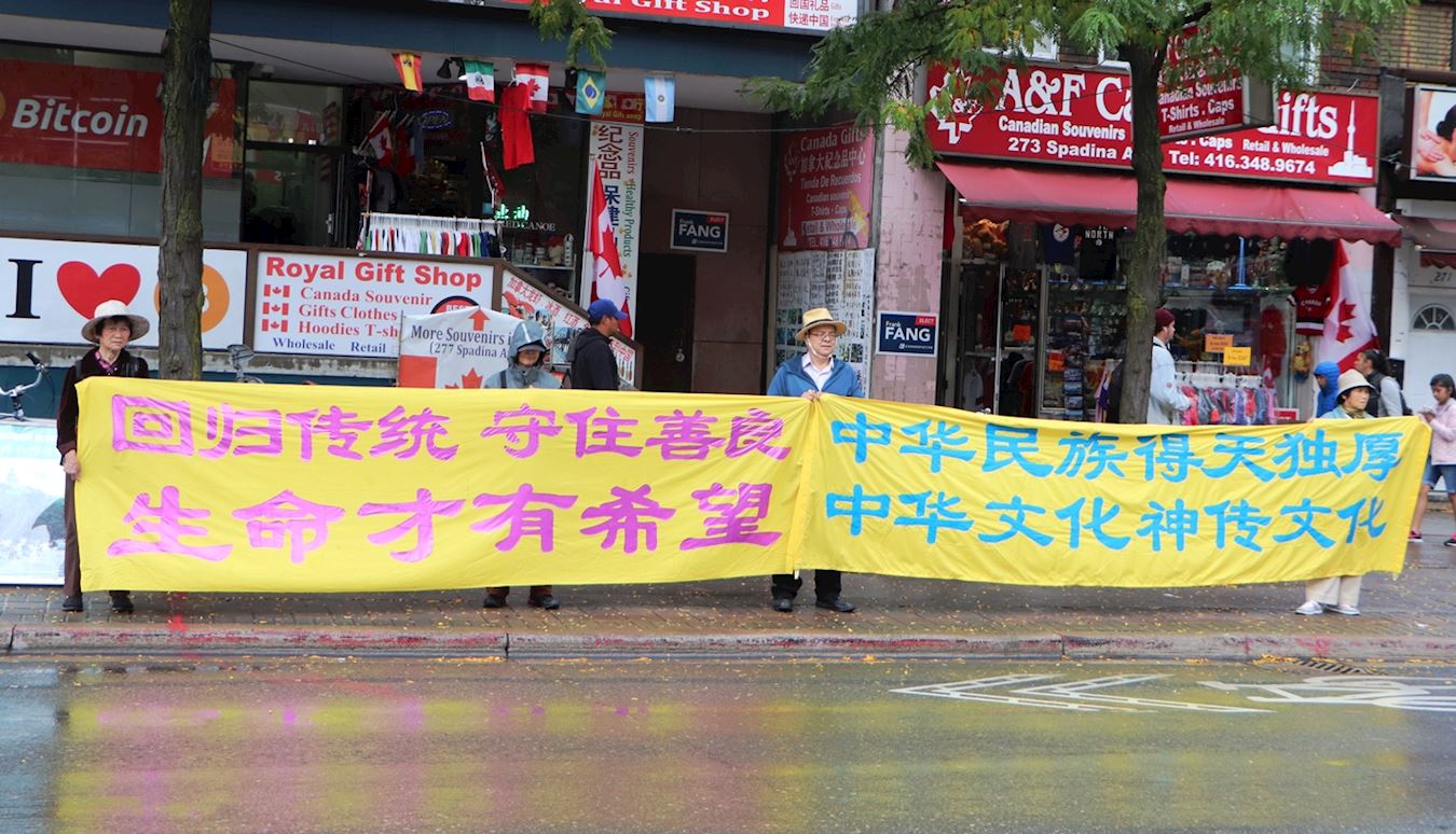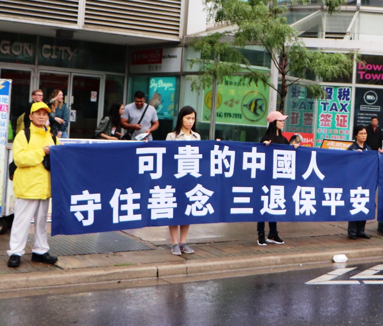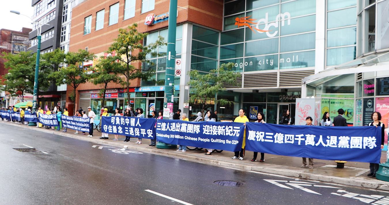 *党-组织,在中区唐人街拉起真相横幅筑起“勇气长城”。'>图1~5:二零一九年九月二十八日下午,加拿大多伦多部份法轮功学员为声援三亿四千万中国勇士退出中共邪*党-组织,在中区唐人街拉起真相横幅筑起“勇气长城”。 |
