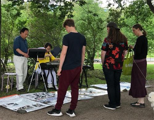 一看效果很好,我们又做了更细致的准备。第二天是周日,我们又增加了两个中文展板和两个英文展板,分别摆在公园两边的小路旁。我们开始演奏,不断有挪威人三五成群,过来聆听。听完之后,就是一阵掌声。然后,同修就去讲真相,这些挪威人明白真相,拿了传单离开了。