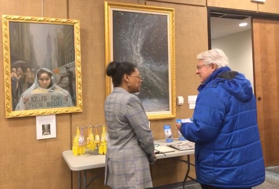 一位修炼法轮功的艺术家首先介绍了具有代表性的几幅作品,讲述了每一幅作品所表现的真实故事。观众们因此了解了当前发生在中国的中共对法轮功的残酷迫害,也了解了七十年来中共的残暴杀人历史。