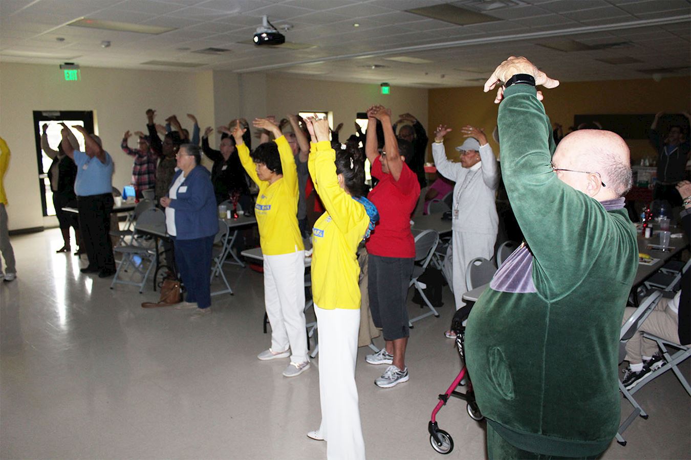法轮功佛学会宋先生,学员杰米作了法轮功介绍,以及播放了录像“什么是法轮功”后,教功正式开始,会员跟着李洪志师父的教功录像学习功法,有个别会员以往长期手臂及腰背或身体疼痛等,抱轮不能坚持较长时间,仍然也试着学做。学功后,会员们表示,能量很强,很好,纷纷索取法轮功介绍传单,现场要求购买书,教功光盘。
