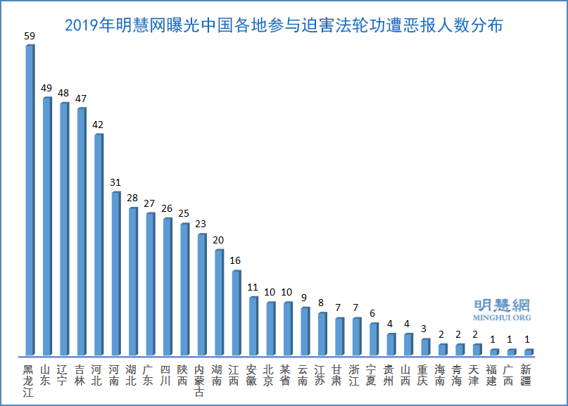 ![]() 图1:2019年明慧网曝光中国各地参与迫害法轮功遭恶报人数分布 |