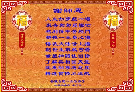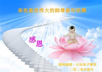 感谢师尊将宇宙大法洪传于世,在末劫时期救度宇宙苍生,将我们从地狱中捞起,使我们有幸成为大法弟子,能在万古难遇的大法中修炼,在正法中能助师正法,救度众生。