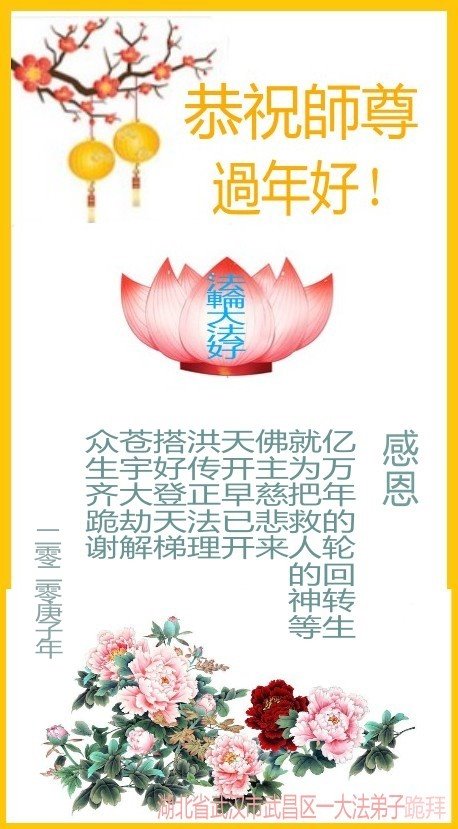 感谢师父的慈悲苦度,在新的一年,我们要更加精進,做好三件事,跟上正法進程。恭祝师父2020新春愉快。万事如意!
