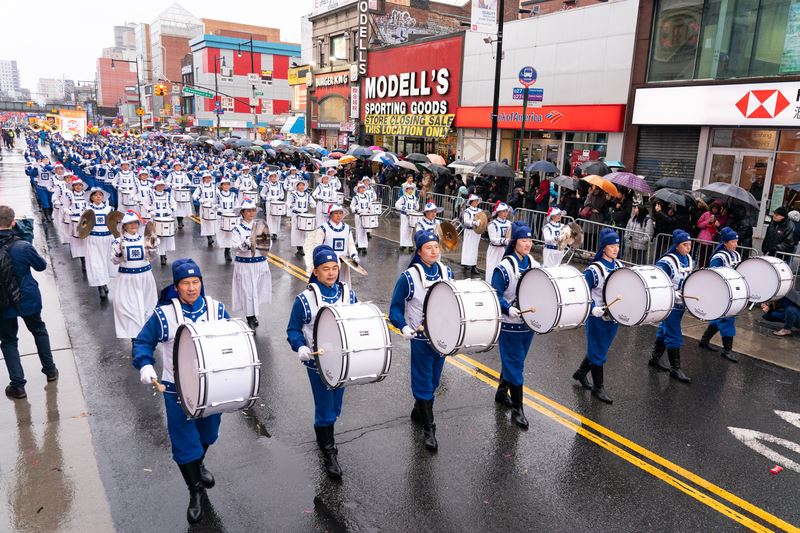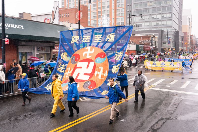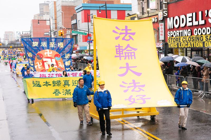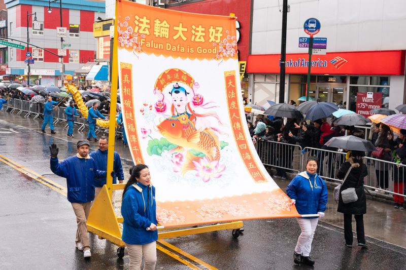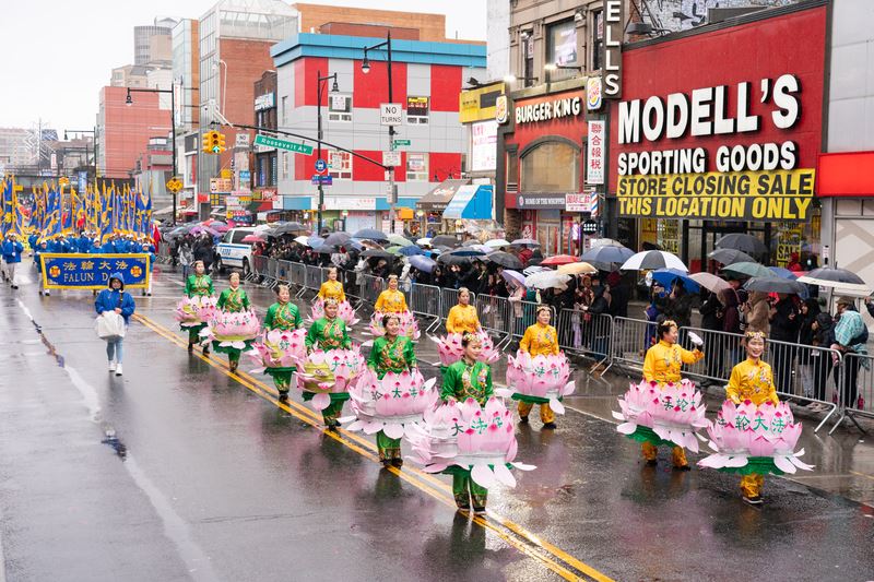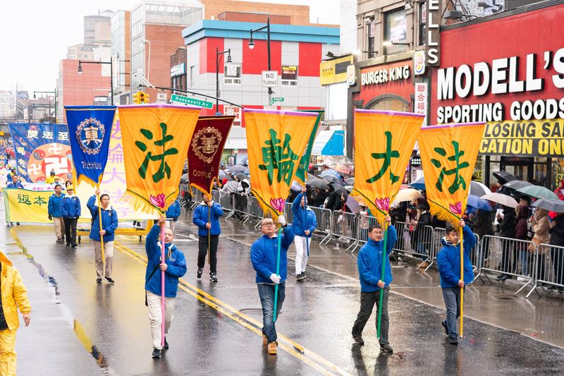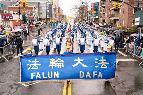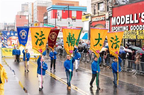 很多华人冒雨在法拉盛观看游行。人们称赞法轮功学员的方阵“漂亮”、“壮观”,认同法轮功的“真、善、忍”理念。