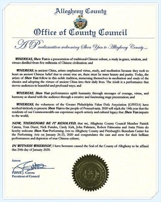 现决议,我们阿勒格尼郡议会议员帕特里克·卡特纳(Patrick Catena),汤姆·杜尔(Tom Duerr),尼克·富特莱斯(Nick Futules),辛迪·科克(Cindy Kirk),约翰·帕尔米耶(John Palmiere),罗伯特·帕尔莫西纳(Robert Palmosina)和安妮塔·普里齐奥(Anita Prizio)特此欢迎神韵艺术团于2020年1月24日至25日到阿勒格尼郡,在匹兹堡的本尼德表演艺术中心演出。并向演员和工作人员致以祝贺,他们出类拔萃地描绘和表演了真正的中国文化;