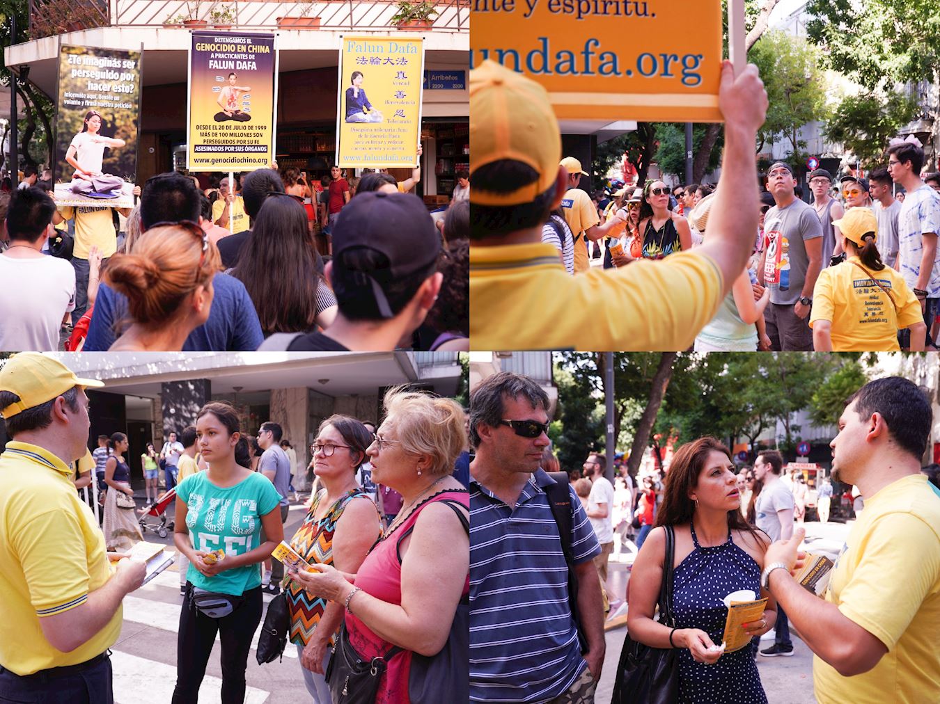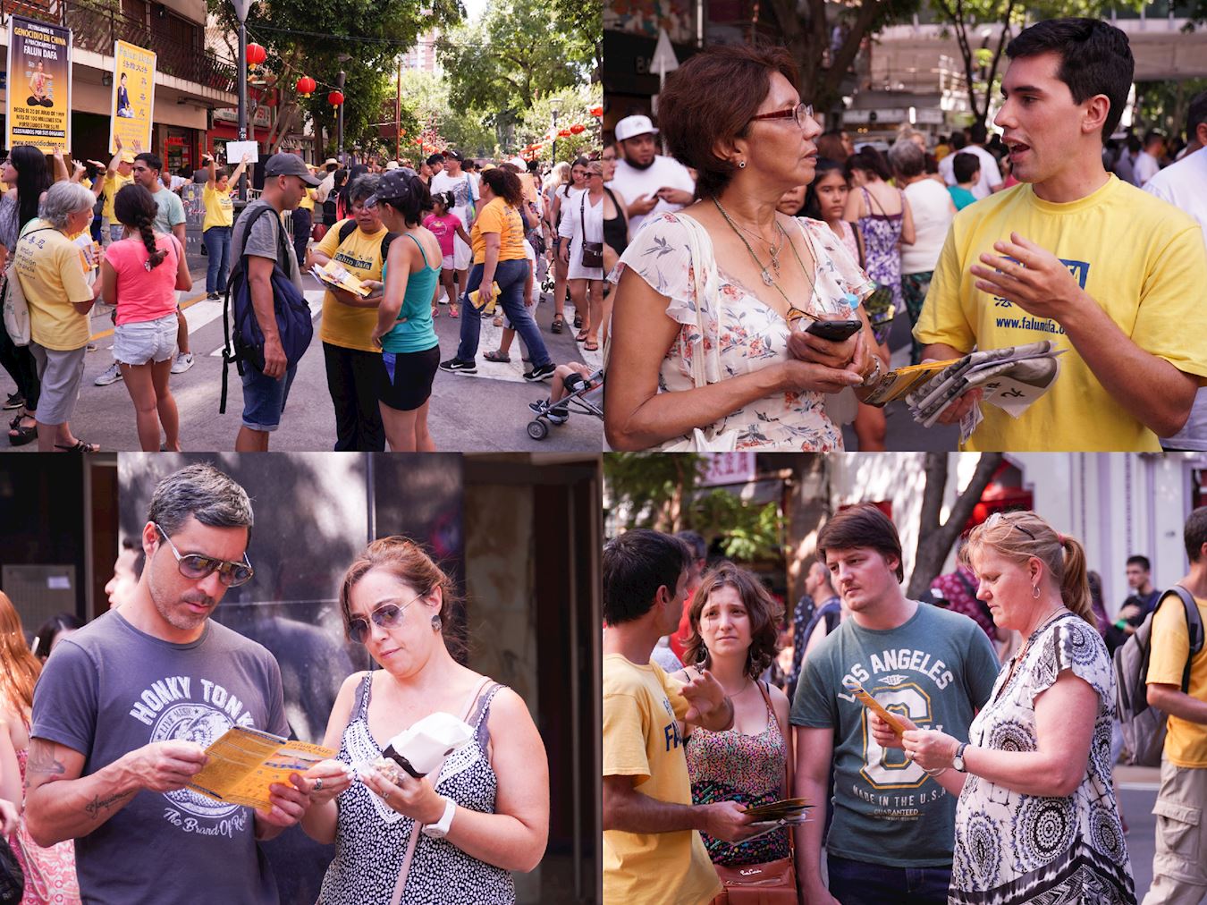 此时的阿根廷正值夏季,这里周末的华人街人山人海。学员们有的演示功法,有的高举真相牌,好让过往行人都看得到、看得清,有的发资料,同时跟人们介绍法轮功。人们了解真相后,纷纷感谢学员。一名从福建来的华人听了真相后,按照阿根廷的习俗,拥抱学员。