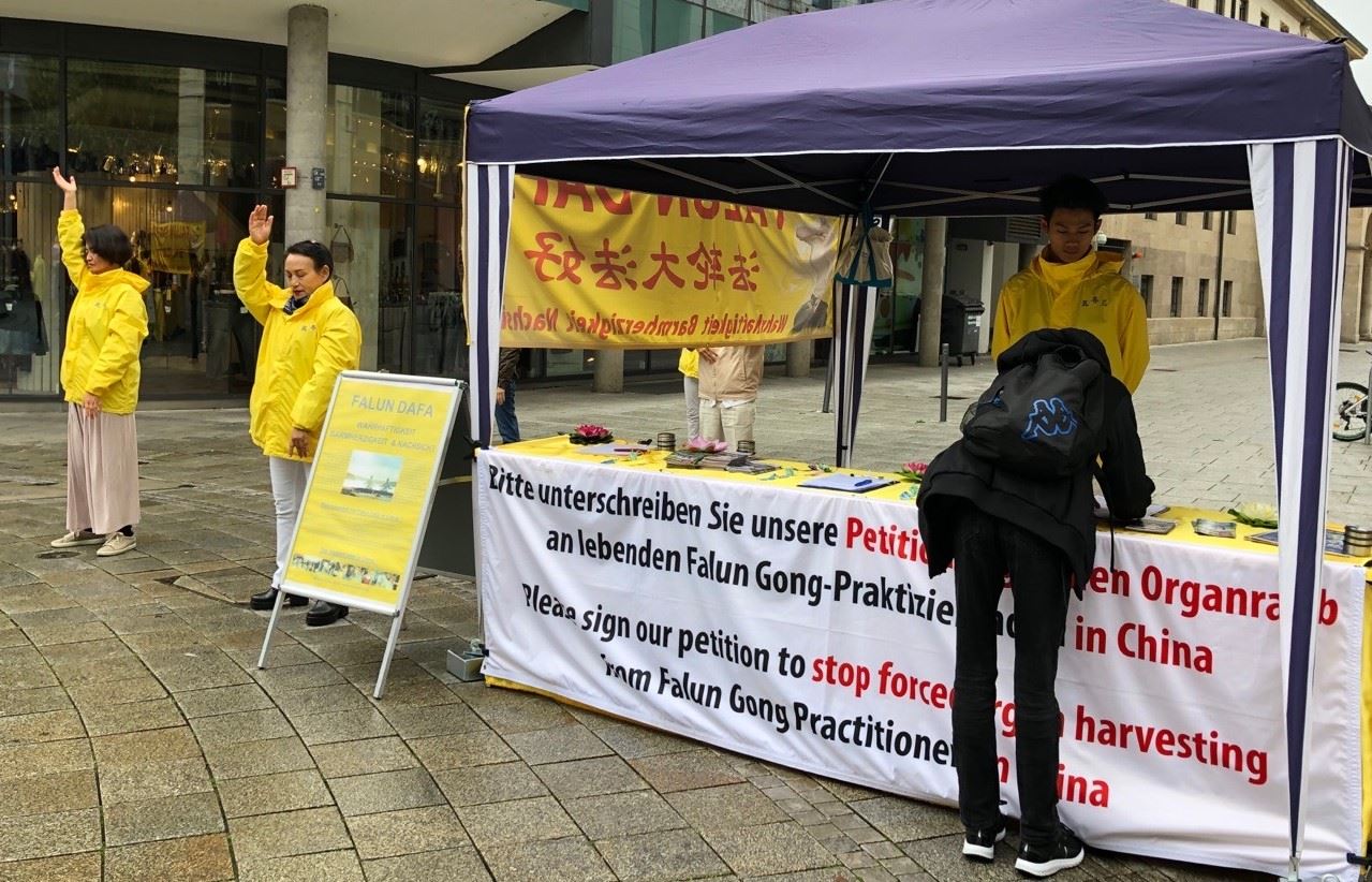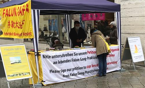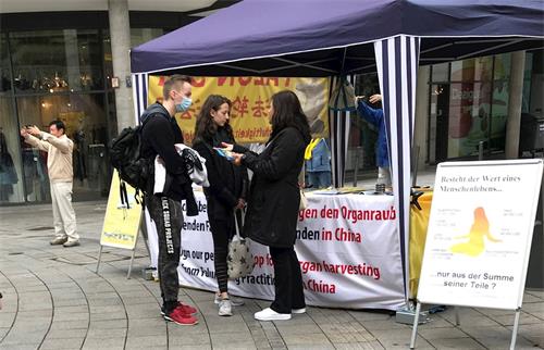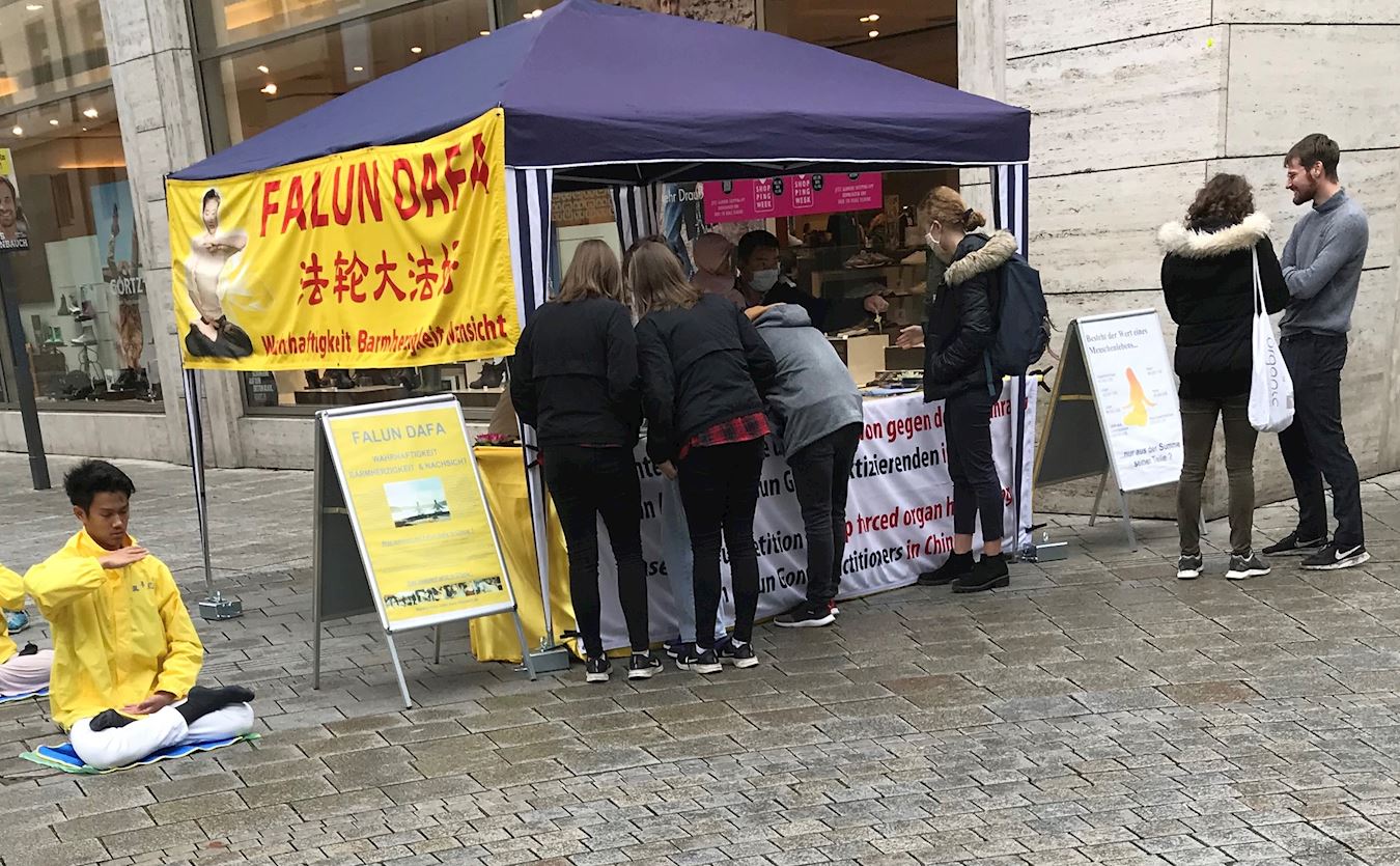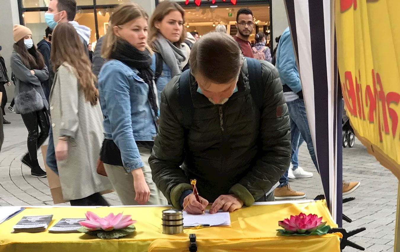 两位来自巴伐利亚的年轻人被法轮功优美的功法所吸引,年轻女士问学员:“这是什么(功法)?”学员告诉她:“这是法轮功。”并向她详细介绍了法轮功在中国被迫害的情况,问她愿不愿意签名,女士有些质疑地问:“我们在德国签名对中国政府能起到作用吗?”学员告诉她:“起作用,如果国际社会的人都知道真相进而反对这场迫害,中共就会有所收敛,不敢无所顾忌地迫害法轮功学员,您可以自己先读一下签名表上的内容,再决定自己要不要签。”最后,这对年轻人一起走向信息台签了名。